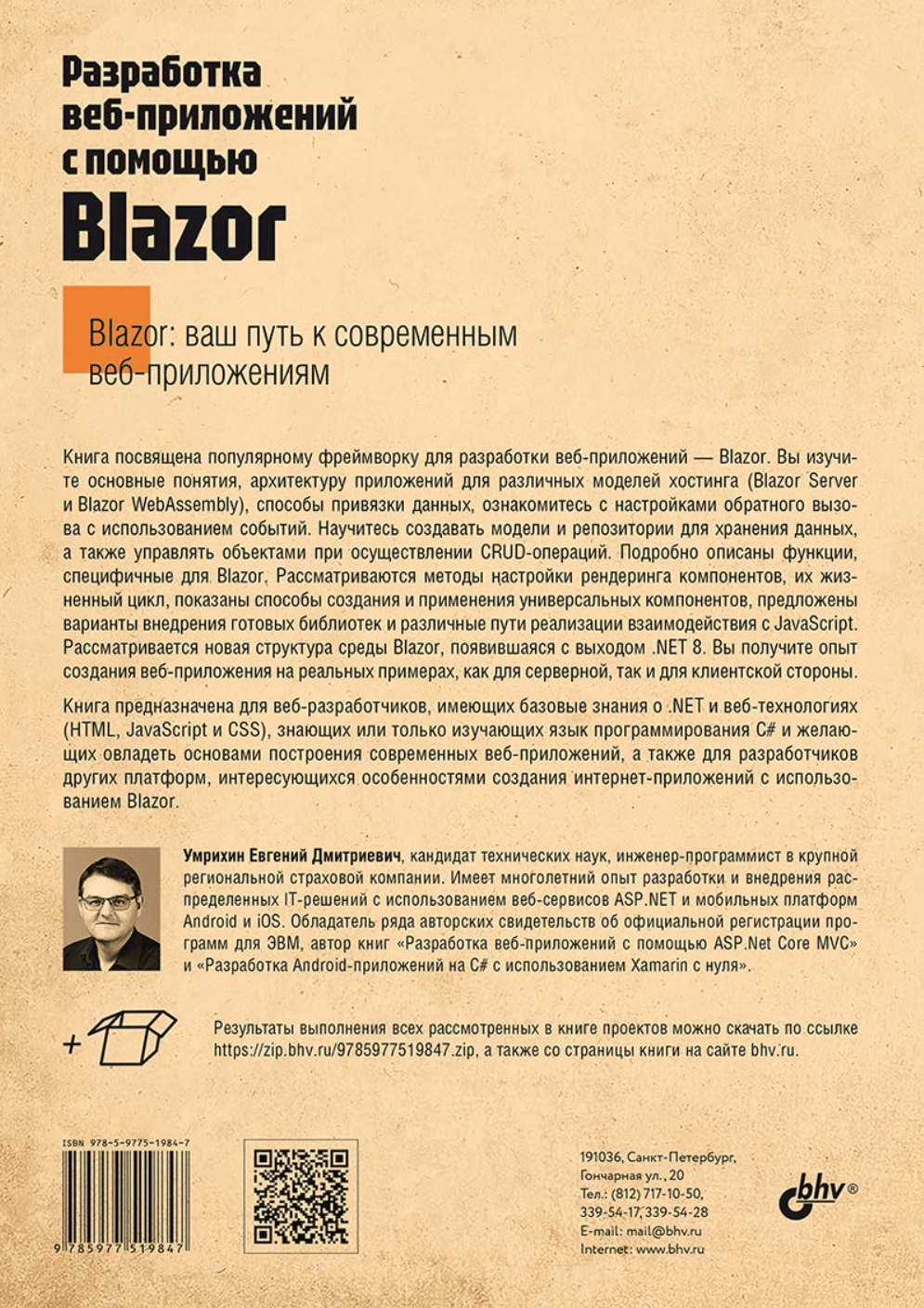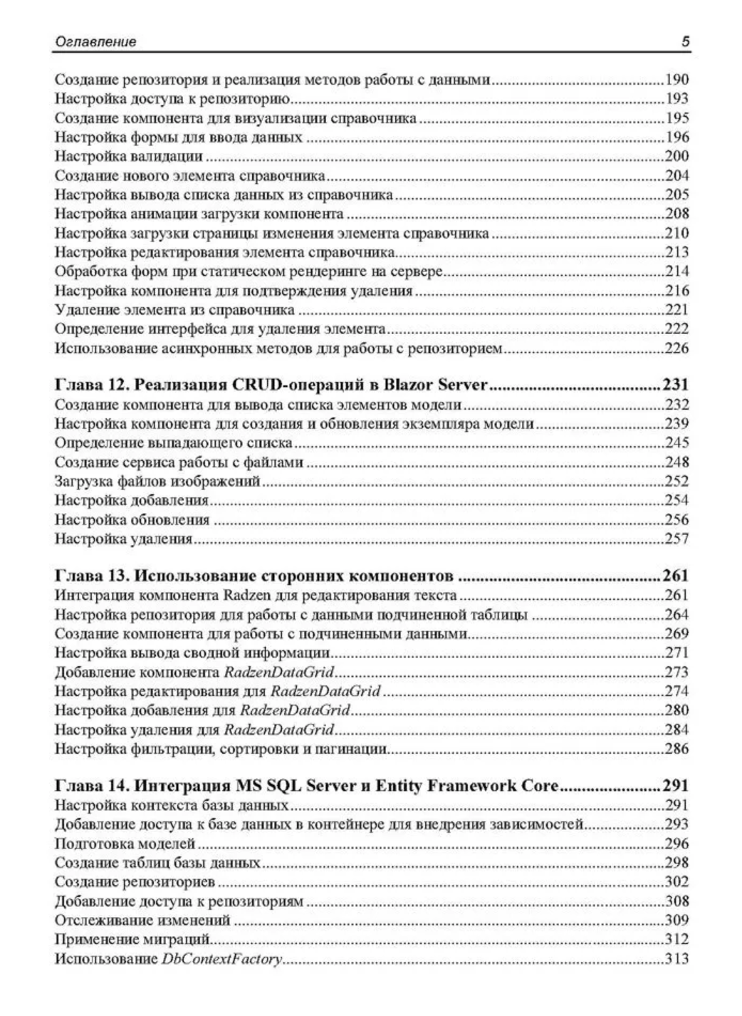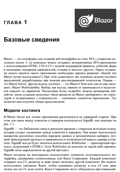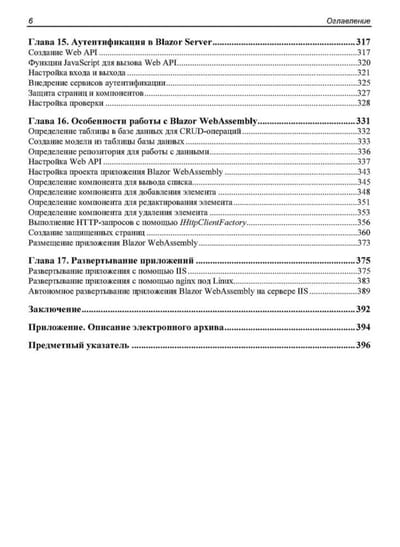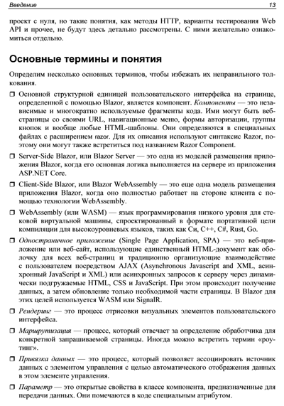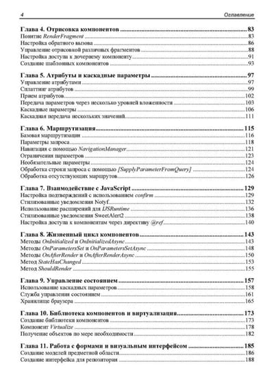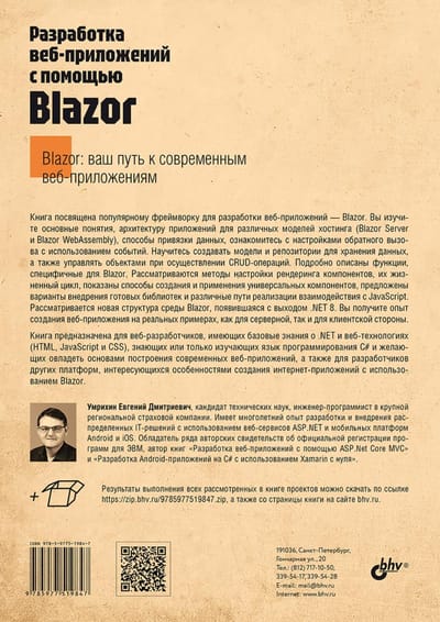 Рассмотрены особенности создания веб-приложений с помощью фреймворка Blazor с обновленной структурой, появившейся с выходом .NET 8. Приведены основные понятия, описана архитектура приложений для различных моделей хостинга (Blazor Server и Blazor WebAssembly) и даны практические примеры реализации таких приложений. Показаны способы привязки данных, настройки обратного вызова с использованием событий. Разобрано создание моделей и репозиториев для хранения данных, управление объектами при осуществлении CRUD-операций. Подробно описаны функции, специфичные для Blazor. Рассматриваются методы настройки рендеринга компонентов, их жизненный цикл, показаны способы создания и применения универсальных компонентов, предложены варианты внедрения готовых библиотек и реализации взаимодействия с JavaScript. Книга ориентирована на разработчиков, имеющих базовые знания о .NET, C# и веб-технологиях (HTML, JavaScript и CSS), желающих овладеть основами веб-разработки с помощью Blazor. Электронный архив на сайте издательства содержит результаты выполнения всех рассмотренных в книге проектов.