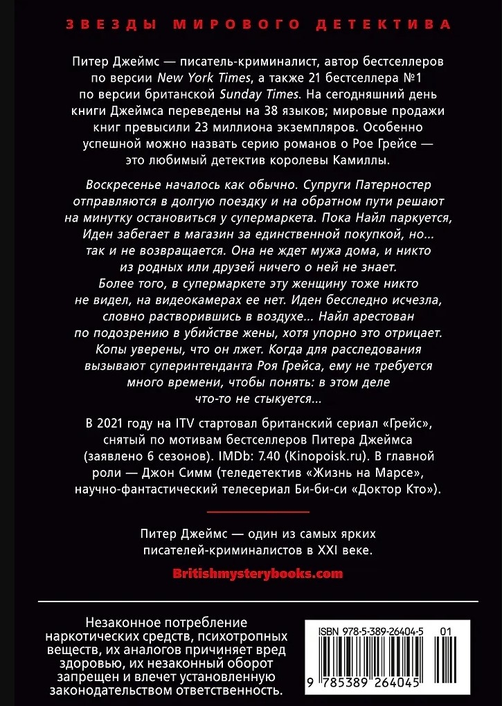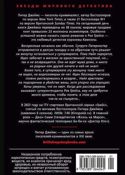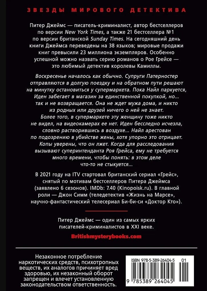 Питер Джеймс — писатель-криминалист, автор бестселлеров по версии «New York Times», а также 21 бестселлера № 1 по версии британской «Sunday Times». Особенно успешной можно назвать серию романов о Рое Грейсе — это любимый детектив королевы Камиллы. В 2021 году на ITV стартовал британский сериал «Грейс», снятый по мотивам книг Джеймса (заявлено 6 сезонов).