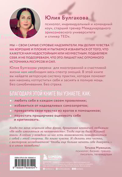 Мы — свои самые суровые надзиратели. Мы делим чувства на хорошие и плохие и пытаемся избавиться от того, что кажется нам недостойным или неуместным. Подавляем себя. И не подозреваем, что это лишает нас огромного источника ресурсов и сил. Юлия Булгакова уверена: для многогранной и счастливой жизни нам необходим весь спектр эмоций. В этой книге вы найдете авторскую систему практик, которая поможет вам наконец «отпустить» себя и засиять в полную мощь. Без самобичевания. Без страха.