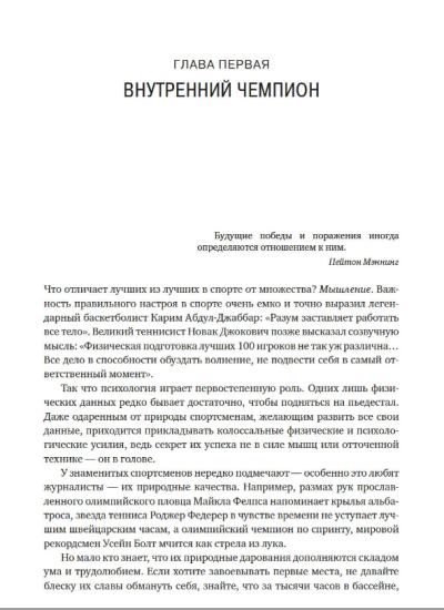 Мы из первых уст узнаем, какими психологическими уловками пользуются спортсмены мирового класса. Поговорим с медалистами о том, как правильный настрой помог им пройти через горнило Олимпиады. Из личных вдохновляющих историй чемпионов США, а также летних и зимних Олимпиад выведем девять золотых истин. Каждый спортсмен расскажет о своем образе мыслей во время тренировок и борьбы за олимпийское золото. Чтобы подготовить себя к достижению лучших результатов, вы научитесь думать, чувствовать и действовать по-чемпионски.