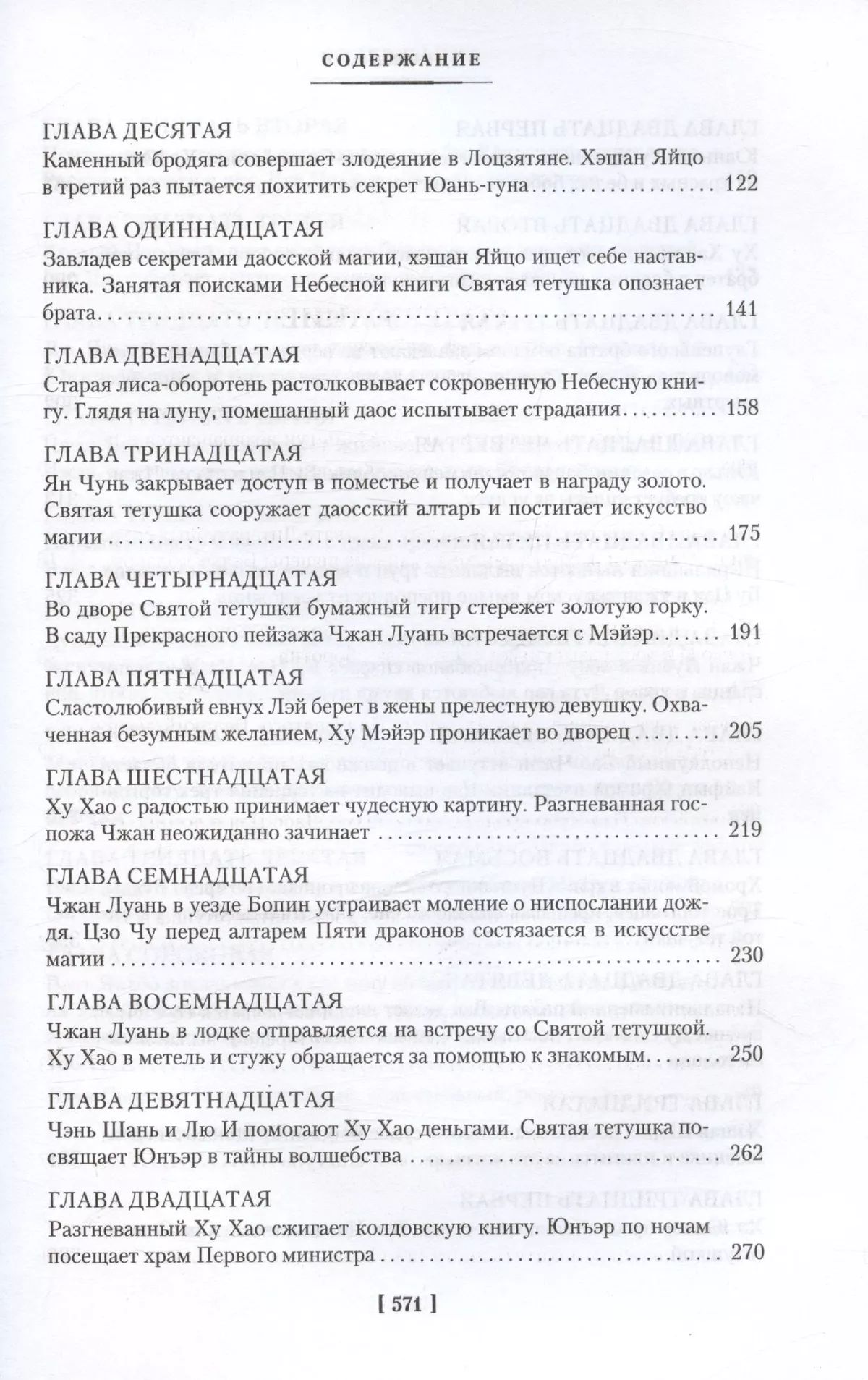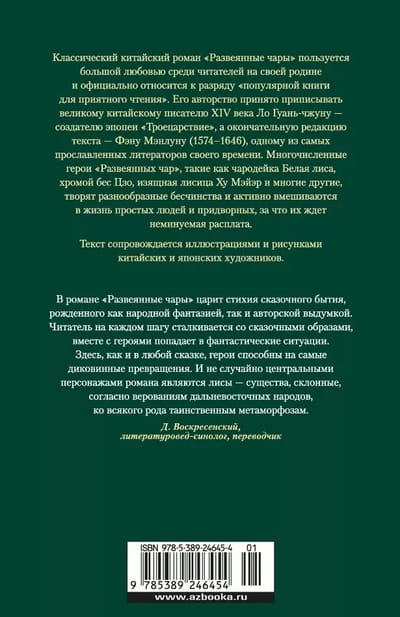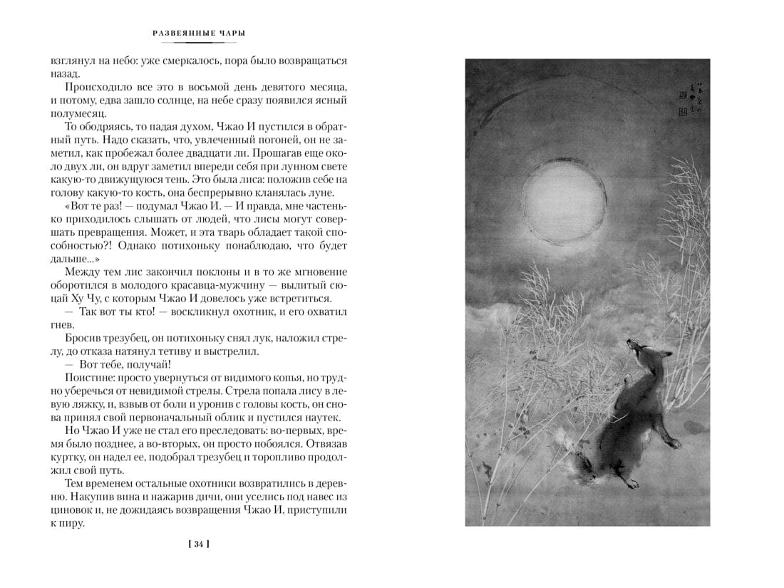 Классический китайский роман «Развеянные чары» пользуется большой любовью среди читателей на своей родине и официально относится к разряду «популярной книги для приятного чтения». Его авторство принято приписывать великому китайскому писателю XIV века Ло Гуань-чжуну — создателю эпопеи «Троецарствие», а окончательную редакцию текста — Фэну Мэнлуну (1574–1646), одному из самых прославленных литераторов своего времени. Многочисленные герои «Развеянных чар», такие как чародейка Белая лиса, хромой бес Цзо, изящная лисица Ху Мэйэр и многие другие, творят разнообразные бесчинства и активно вмешиваются в жизнь простых людей и придворных, за что их ждет неминуемая расплата. Текст сопровождается иллюстрациями и рисунками китайских и японских художников.