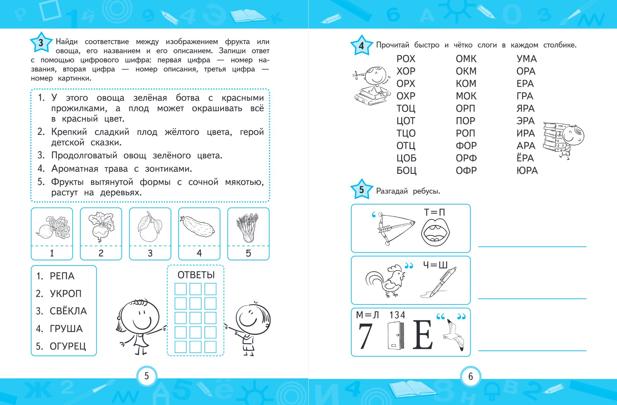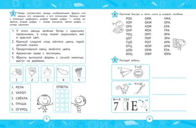 Развивающие задания составлены таким образом, чтобы каждое упражнение продвинуло маленького читателя на шаг вперёд. Книга разделена на 6 больших тематических глав: «Фрукты, овощи и ягоды», «Цветы», «Птицы», «Насекомые», «Дикие звери», «Рыбы», по 14 разноплановых заданий на отработку навыков беглого чтения в каждой. В конце глав имеются ответы для самопроверки.