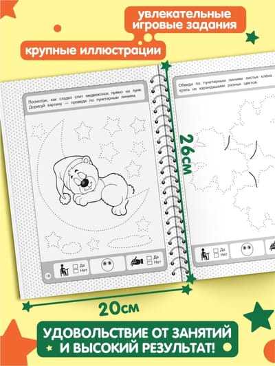 Книга от издательства «Эксмо» — это настоящая находка для родителей, чьи дети скоро пойдут в 1 класс. Пособие, соответствующее ФГОС, четко структурировано и поможет быстро и качественно подготовить руку ребенка к письму. Крупные занимательные картинки будут мотивировать ребенка, и он получить огромное удовольствие от своей деятельности. Занимаясь, дошкольник будет аккуратно обводить по пунктиру и проводить разные типы линий, проходить веселые лабиринты, рисовать узоры. Внизу каждой страницы имеются значки для оценки выполненных заданий. Поставив галочку в клетках «да» или «нет», ребенок сможет проконтролировать себя, а нарисовав ротик у смайлика вверх или вниз — оценить результат (хорошо / не очень хорошо). Постоянная работа с пособием поможет дошкольнику развить мелкую моторику, графические навыки, внимание, творческие способности, стать более усидчивым и аккуратным.