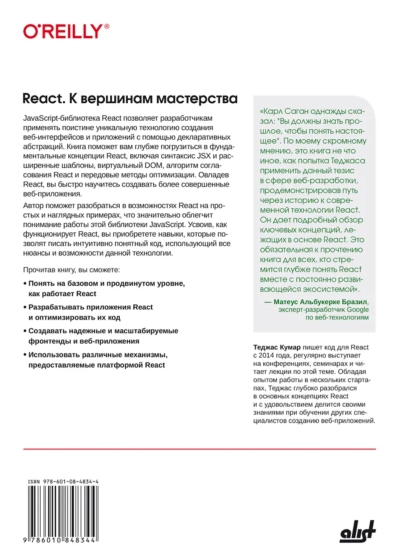 Рассматривается разработка веб-интерфейсов и веб-приложений с использованием React — популярной библиотеки JavaScript для создания пользовательских интерфейсов. Рассмотрены фундаментальные концепции React, такие как синтаксис JSX, виртуальный DOM, алгоритм согласования и передовые методы оптимизации. Благодаря простым и наглядным примерам, книга помогает понять работу React как на базовом, так и на продвинутом уровне, оптимизировать код и использовать различные механизмы React. Книга поможет овладеть навыками написания интуитивно понятного кода и максимально эффективно использовать все возможности React для создания современных веб-приложений.