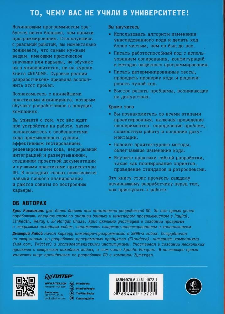 Начинающим программистам требуется нечто большее, чем навыки программирования. Столкнувшись с реальной работой, вы моментально понимаете, что самым нужным вещам, имеющим критическое значение для карьеры, не обучают ни в университетах, ни на курсах. Книга «README. Суровые реалии разработчиков» призвана восполнить этот пробел.