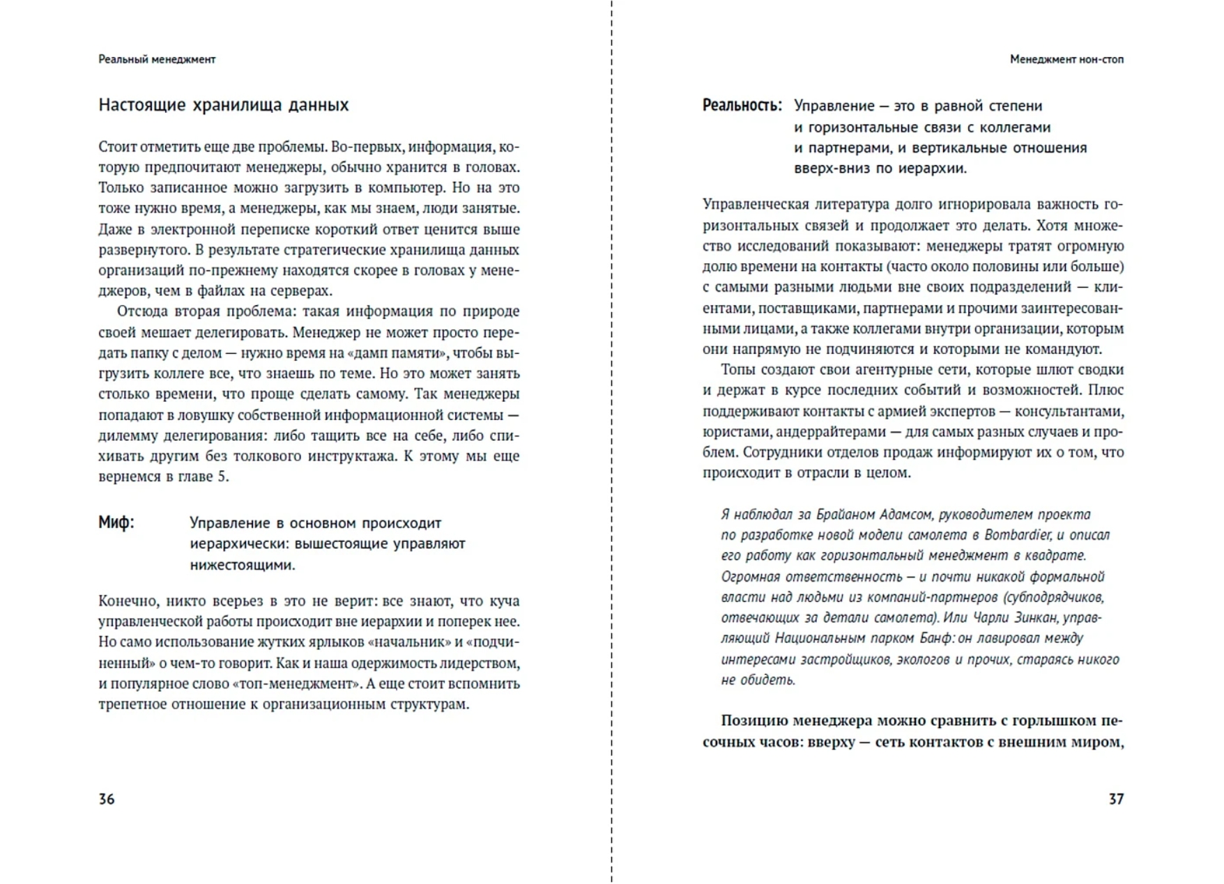 На основании исследования реальной работы руководителей из самых разных отраслей он доказывает, что эффективное лидерство неотделимо от повседневной управленческой работы, а попытка быть «чистым» лидером, оторванным от рутины, — один из главных мифов, который мешает добиваться реальных результатов. Минцберг описывает реальный мир управления: бешеный темп, постоянные помехи и переключения, хаос, противоречивость и фрагментарность задач.