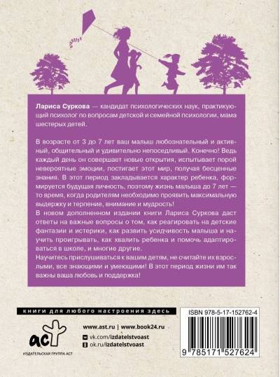 В новом дополненном издании книги Лариса Суркова даст ответы на важные вопросы о том, как реагировать на детские фантазии и истерики, как развить усидчивость малыша и научить проигрывать, как хвалить ребенка и помочь адаптироваться в школе и многие другие.