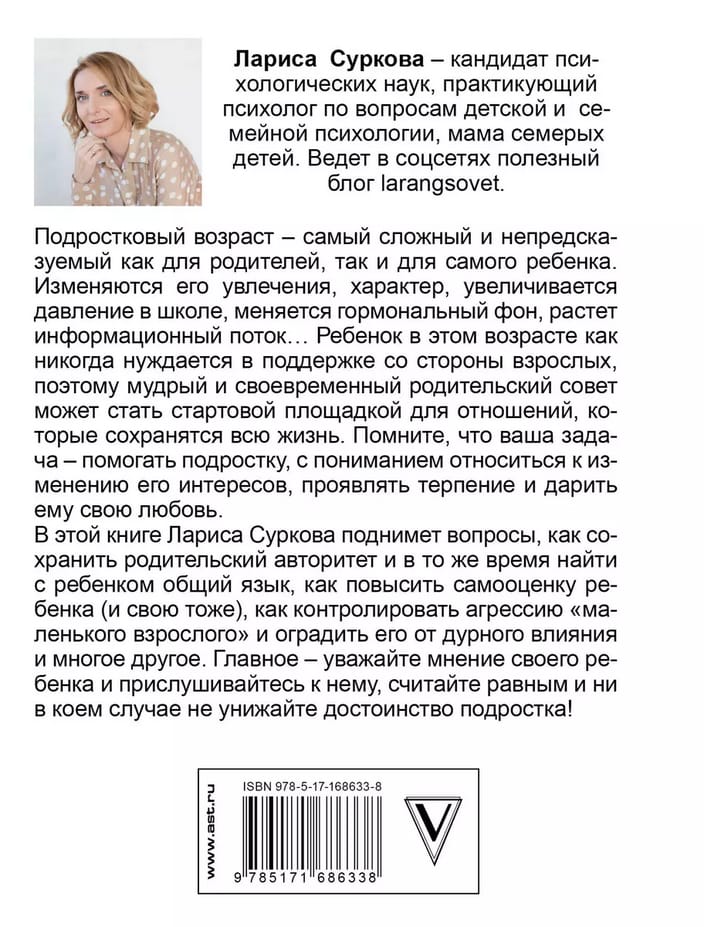 В этой книге Лариса Суркова поднимет вопросы, как сохранить родительский авторитет и в то же время найти с ребенком общий язык, как повысить самооценку ребенка (и свою тоже), как контролировать агрессию «маленького взрослого» и оградить его от дурного влияния и многое другое. Главное – уважайте мнение своего ребенка и прислушивайтесь к нему, считаете равным и ни в коем случае не унижайте достоинство подростка!