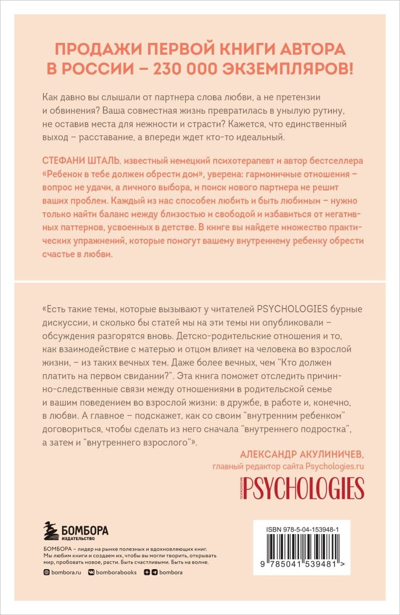Как давно вы слышали от партнера слова любви, а не претензии и обвинения? Ваша совместная жизнь превратилась в унылую рутину, не оставив места для нежности и страсти? Кажется, что единственный выход — расставание, а впереди ждет кто-то идеальный. Стефани Шталь, известный немецкий психотерапевт и автор бестселлера «Ребенок в тебе должен обрести дом», уверена: гармоничные отношения — вопрос не удачи, а личного выбора, и поиск нового партнера не решит ваших проблем. Каждый из нас способен любить и быть любимым — нужно только найти баланс между близостью и свободой и избавиться от негативных паттернов, усвоенных в детстве. В книге вы найдете множество практических упражнений, которые помогут вашему внутреннему ребенку обрести счастье в любви.