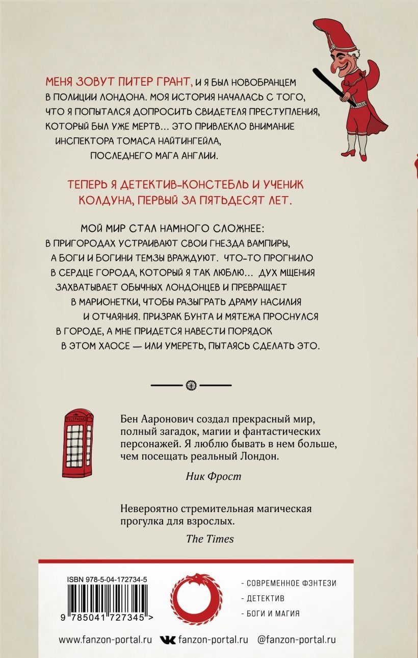 Меня зовут Питер Грант, и я был на испытательном сроке в должности констебля в этой могущественной армии правосудия, которую законопослушные люди называют лондонской полицией. Моя история началась, когда я попытался допросить свидетеля преступления, который был уже мертв… Это привлекло внимание инспектора Томаса Найтингейла, последнего мага в Англии. Теперь я детектив-констебль и ученик колдуна, первый за последние пятьдесят лет. Мой мир стал намного сложнее: в пригородах устраивают свои гнезда вампиры, боги и боги Темзы враждуют, а в сердце города, который я так люблю, что-то прогнило… Злонамеренный мстительный дух захватывает обычных лондонцев и превращает в марионетки, чтобы разыграть драму насилия и отчаяния. Призрак бунта и мятежа проснулся в городе, а мне придется навести порядок в этом хаосе — или умереть, пытаясь сделать это.