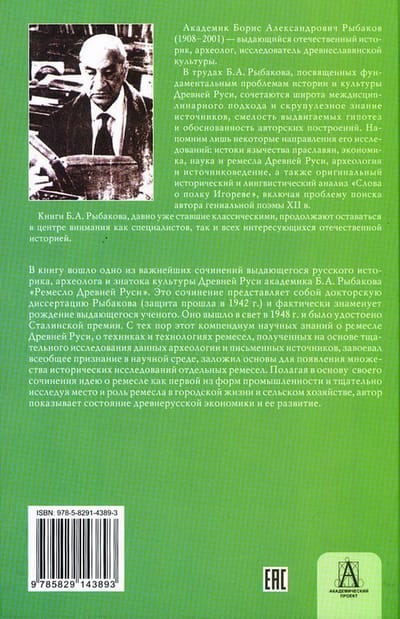 В книгу вошло одно из важнейших сочинений выдающегося русского историка, археолога и знатока культуры Древней Руси академика Б. А. Рыбакова «Ремесло Древней Руси». Это сочинение представляет собой докторскую диссертацию Рыбакова (защита прошла в 1942 г.) и фактически знаменует рождение выдающегося ученого. Оно вышло в свет в 1948 г. и было удостоено Сталинской премии.