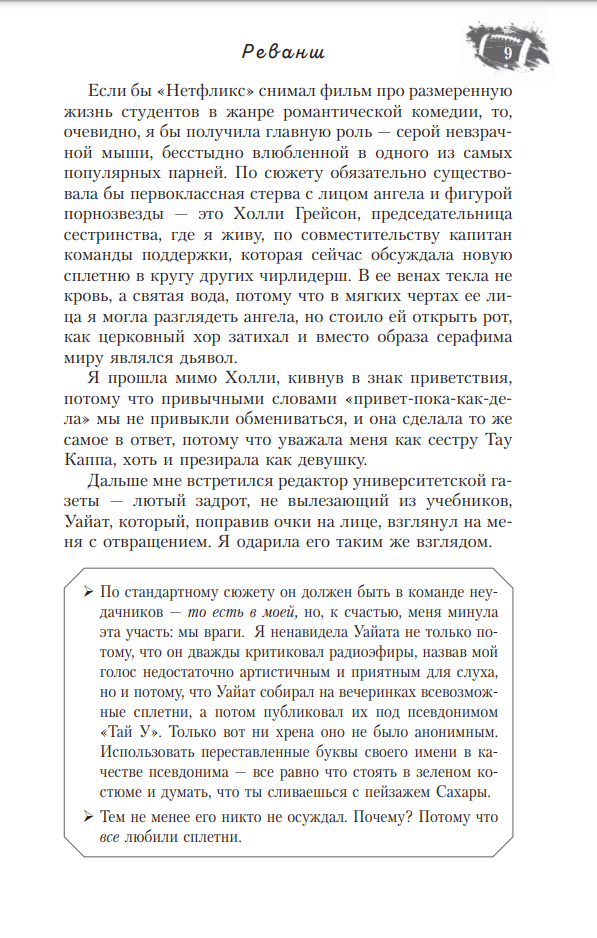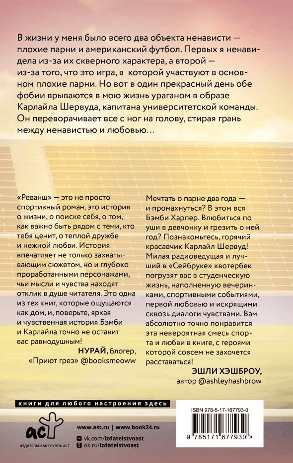 В жизни у меня было всего два объекта ненависти — плохие парни и американский футбол. Первых я ненавидела из-за их скверного характера, а второе из-за того, что это игра, в которой участвуют в основном плохие парни. Но вот в один прекрасный день обе фобии врываются в мою жизнь ураганом в образе Карлайла Шервуда, капитана университетской команды. Он переворачивает все с ног на голову, стирая грань между ненавистью и любовью…