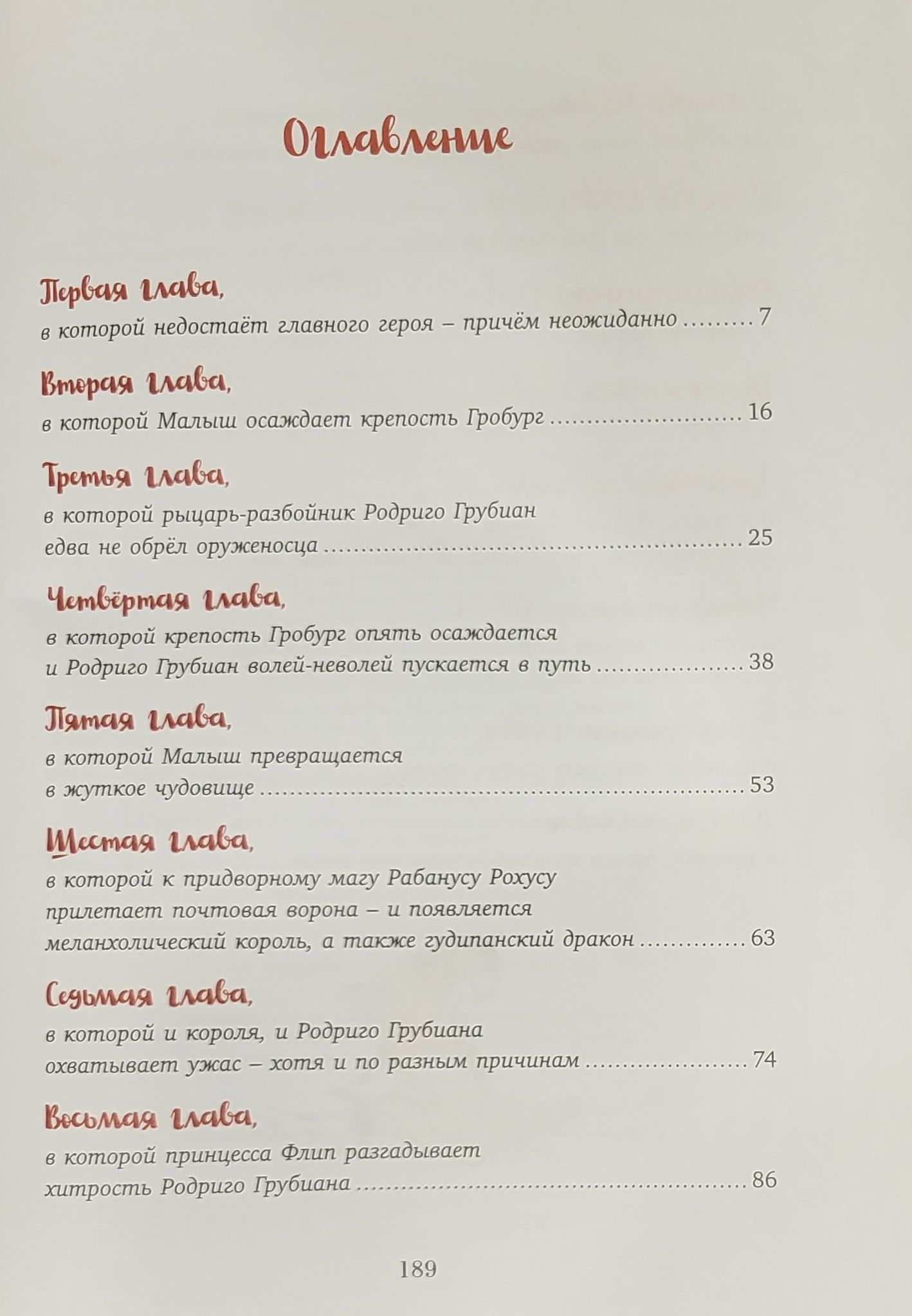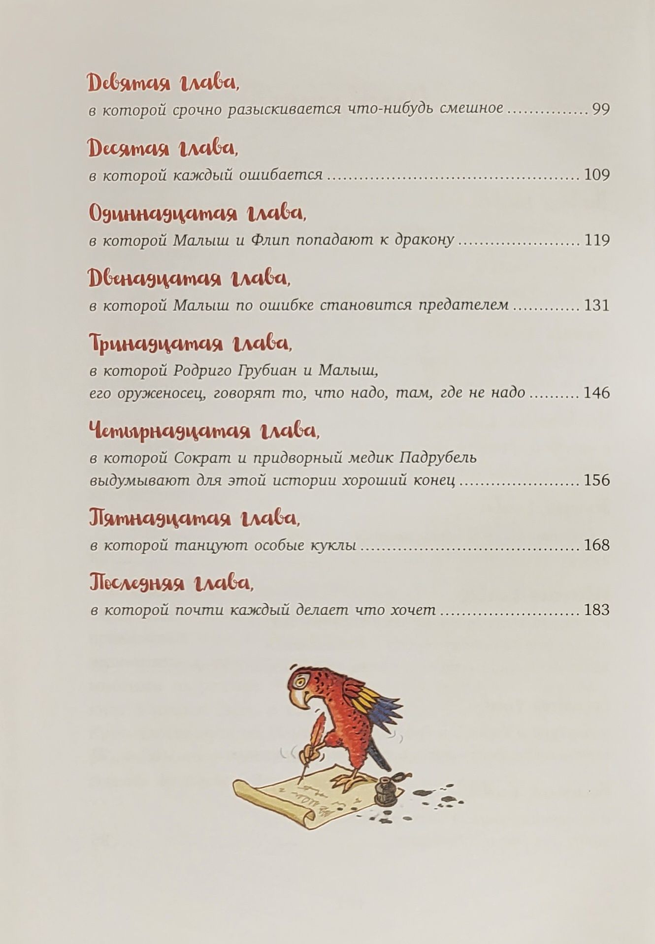 Рыжеволосый Малыш, которому наскучила однообразная жизнь странствующего кукольного театра, отправляется на поиски рыцаря-разбойника Родриго Грубиана, чтобы стать его оруженосцем. Рыцарь намерен испытать Малыша и даёт ему особое задание. Малыш готов на всё и отправляется в путь. Наткнувшись в один прекрасный день на карету принцессы, он понимает, что это его шанс. И конечно же в достижении своей цели ему никак не избежать встречи с коварным чародеем и огнедышащим драконом…