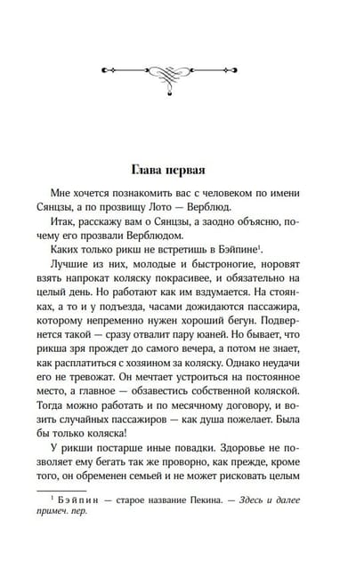 Лао Шэ поведает историю одного из них – сироты Сянцзы по прозвищу Верблюд – простодушного и честного парня, чьей заветной мечтой было скопить деньги на собственную коляску, чтобы обеспечить себе стабильный заработок и ни от кого не зависеть. Сянцзы целеустремлен, отказывая себе во всем, он работает от зари до зари четыре года и почти достигает заветной цели, но в один миг рикша теряет все…