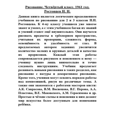 Данная книга является логическим продолжением учебников по рисованию для 2 и 3 классов Н.Н. Ростовцева. К 4-му классу учащиеся уже многое знают и умеют, а с этим учебником багаж их знаний и умений станет ещё внушительнее. Они научатся рисовать предметы в трёхмерном пространстве, учитывая их пропорции, сложность формы, освещённость и удалённость от глаз. В предлагаемых автором заданиях увеличится количество мелких и крупных деталей и качество их прорисовки. Каждый этап работы сопровождается рисунком и пояснением к нему — ученику нужно лишь внимательно и точно следовать инструкциям. Учебник предлагает развивать навыки рисования в таких разделах, как рисование с натуры и декоративное рисование. Кроме того, ученики могут освоить порядок работы над композицией, рисуя на различные темы. А также они знакомятся с работами мастеров кисти: А.К. Саврасова, В.М. Васнецова, В.Г. Перова, А.А. Пластова, В.Е. Маковского, А.М. Герасимова и др. Простые и чёткие схемы и пояснения к ним делают мир искусства более доступным для понимания ребёнка.