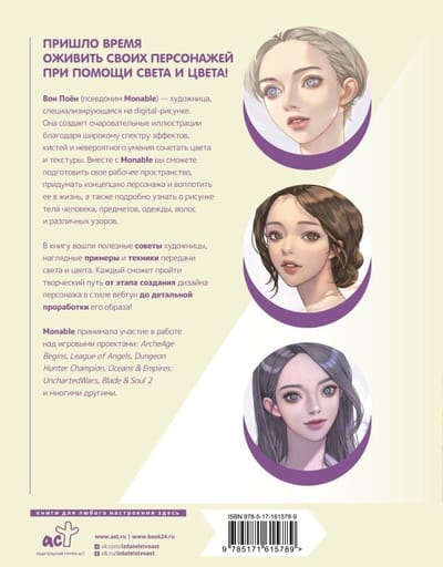 Вон Поён (псевдоним Monable) — художница, специализирующаяся на digital-рисунке. Она создает очаровательные иллюстрации благодаря широкому спектру эффектов, кистей и невероятного умения сочетать цвета и текстуры. Вместе с Monable вы сможете подготовить свое рабочее пространство, придумать концепцию персонажа и воплотить ее в жизнь, а также подробно узнать о рисунке тела человека, предметов, одежды, волос и различных узоров. В книгу вошли полезные советы художницы, наглядные примеры и техники передачи света и цвета. Каждый сможет пройти творческий путь от этапа создания дизайна персонажа в стиле вебтун до детальной проработки его образа! Monable принимала участие в работе над игровыми проектами: ArcheAge Begins, League of Angels, Dungeon Hunter Champion, Oceans & Empires: UnchartedWars, Blade & Soul 2 и многими другими.