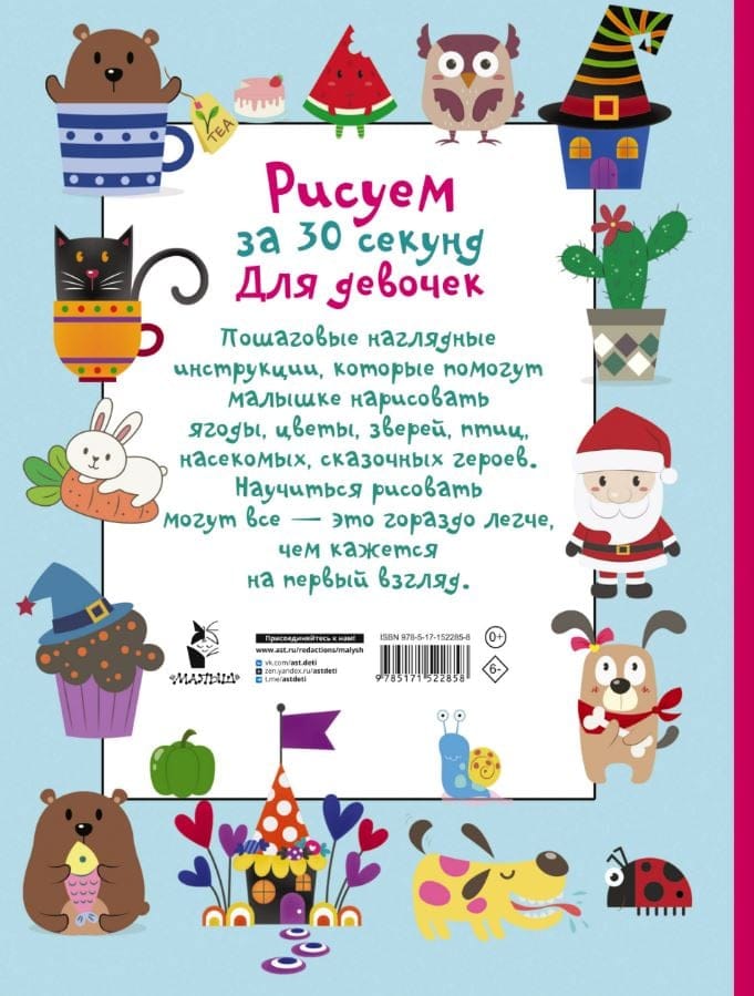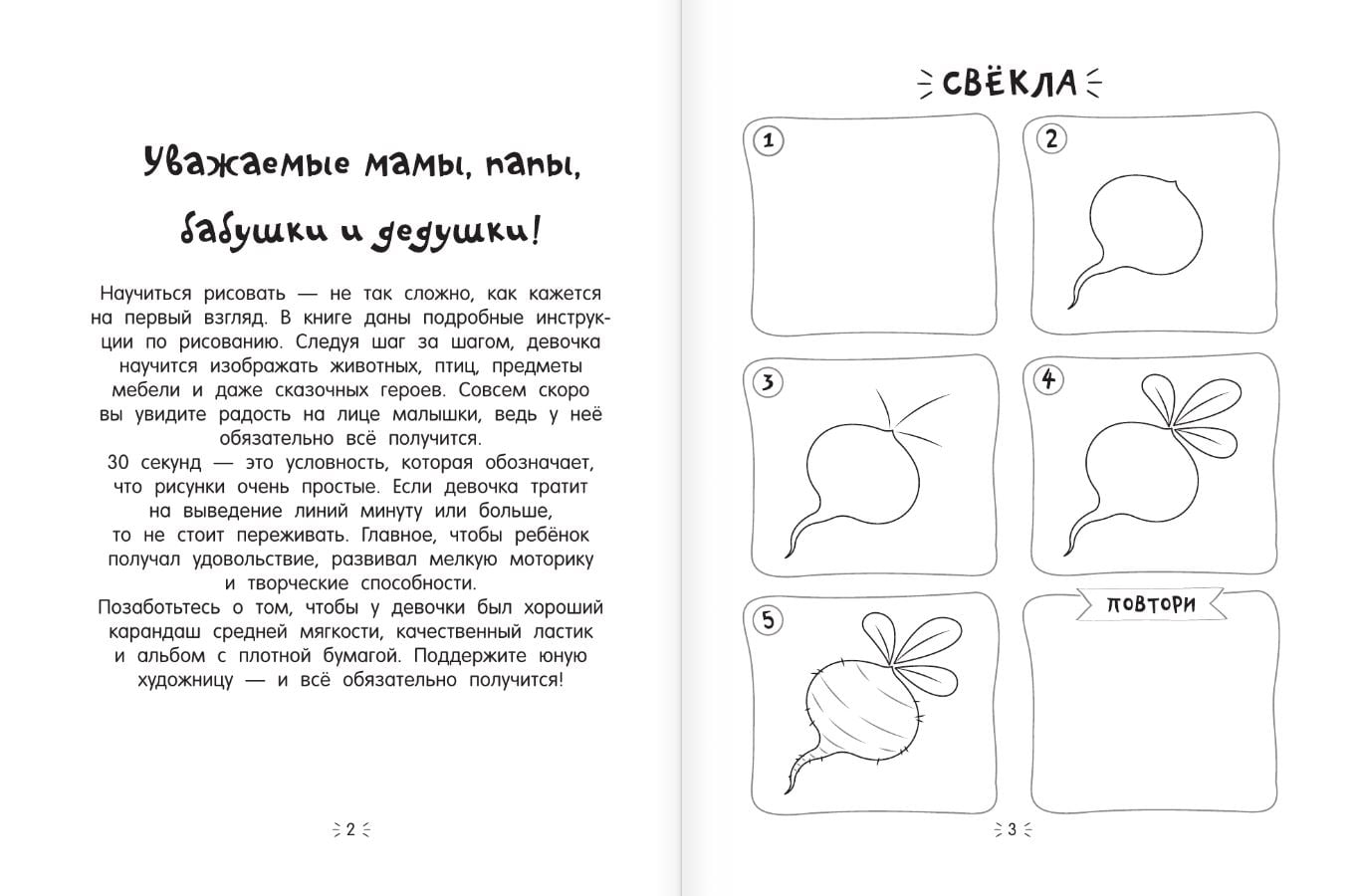 Дочь постоянно просит нарисовать что-то, но вы не умеете? Или малышка делает первые шаги в мире рисования, а вы не знаете, как ей помочь? Решение есть! Воспользуйтесь книгой «Рисуем за 30 секунд для девочек». Вы увидите, что вовсе необязательно оканчивать художественную школу, чтобы красиво рисовать! Достаточно провести несколько чёрточек и пару кружков и квадратиков и готово — на альбомном листе уже красуются симпатичные рисунки!