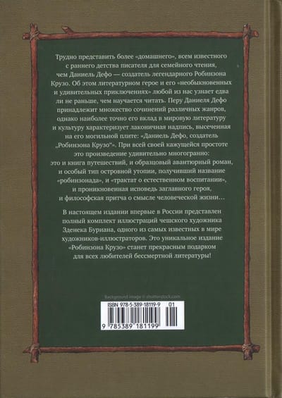 В настоящем издании представлен полный комплект иллюстраций чешского художника Зденека Буриана, одного из самых известных в мире художников-иллюстраторов. Это уникальное издание «Робинзона Крузо» станет прекрасным подарком для всех любителей бессмертной литературы!