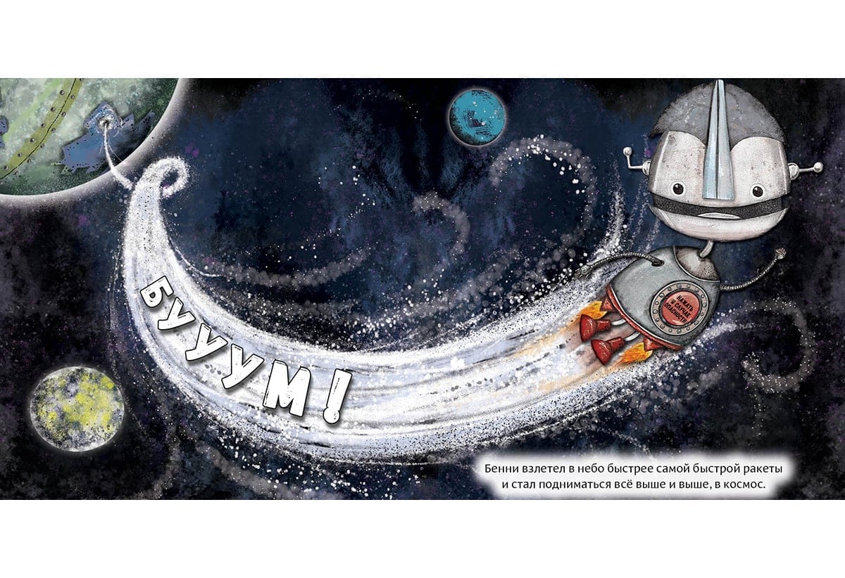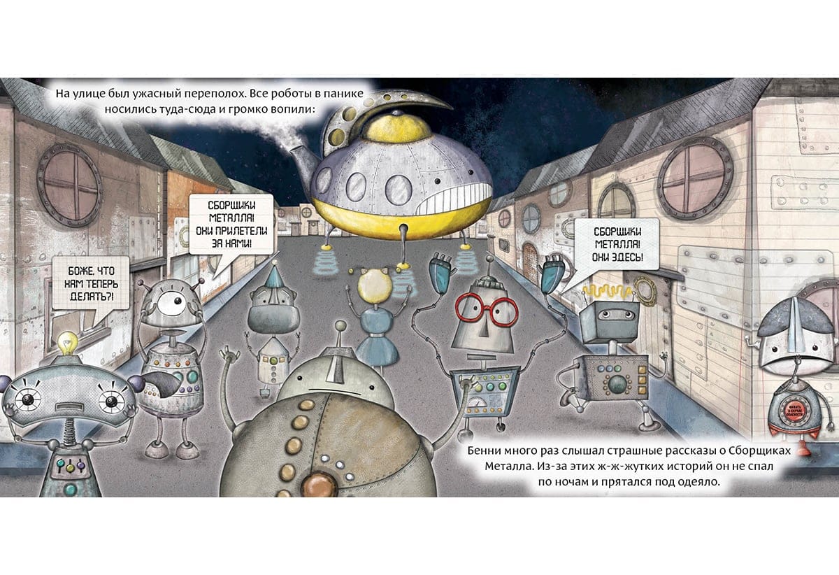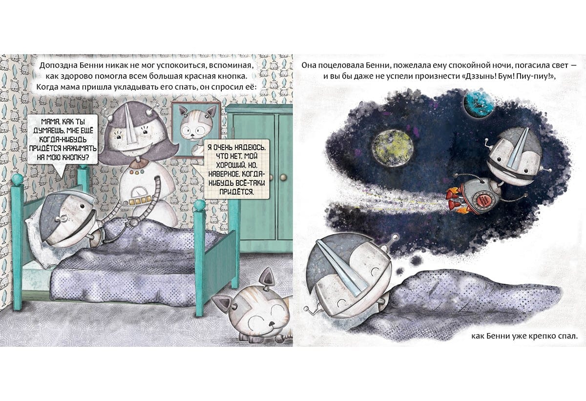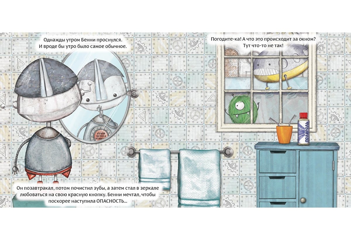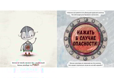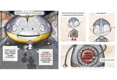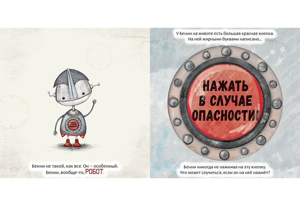 Бенни был особенным роботом, ведь у него была всего лишь одна красная кнопка. На ней большими буквами было написано: «Нажать в случае опасности!» Бенни никогда не нажимал на кнопку, но часто думал о том, что может случиться, если он на неё нажмёт. И совсем скоро он это узнает…