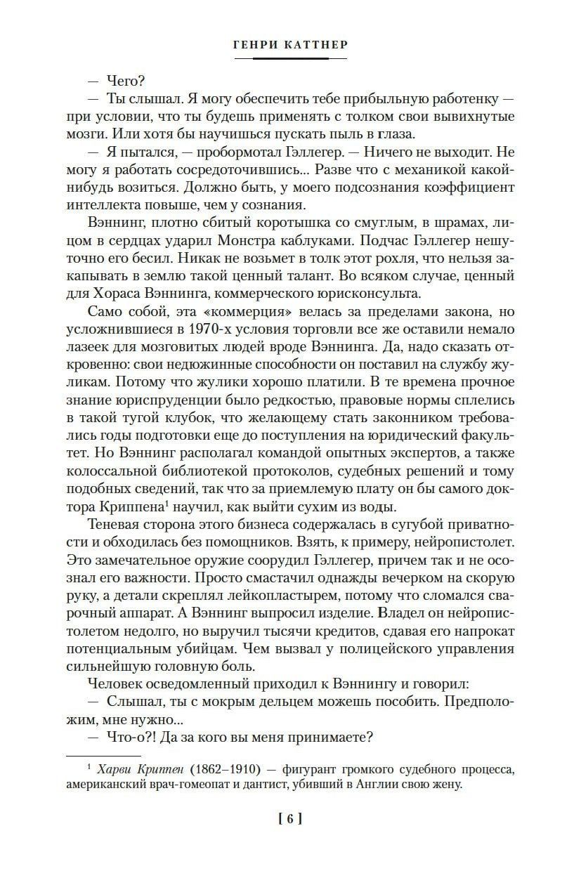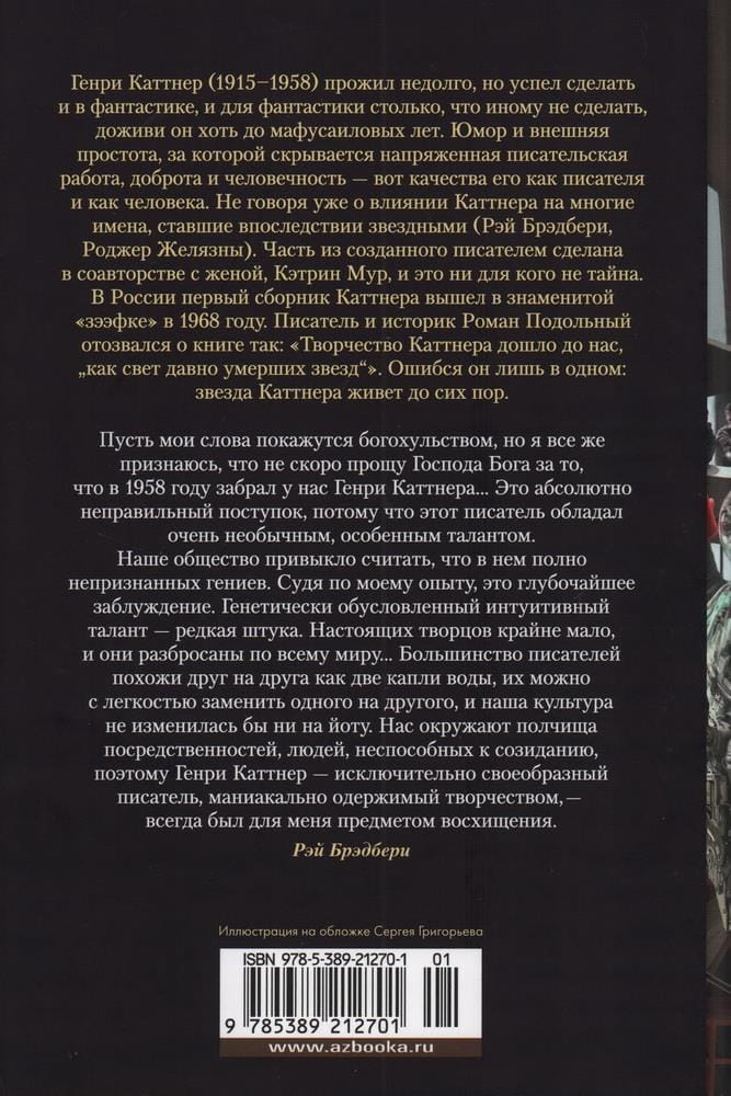 Генри Каттнер, публиковавшийся не только под своей настоящей фамилией, но и под доброй дюжиной псевдонимов, считается одним из четырех или пяти ведущих американских фантастов 1940-х. Легендарные жанровые журналы, такие как «Future», «Thrilling Wonder», «Planet Stories» и «Weird Tales», более чем охотно принимали произведения, написанные им самостоятельно или в соавторстве с женой, известным мастером фантастики и фэнтези Кэтрин Люсиль Мур; бывало, что целый выпуск журнала отводился для творчества Каттнера. Почти все, созданное этим автором, имеет оттенок гениальности, но особенно удавалась ему «малая литературная форма»: рассказы о мутантах Хогбенах, о чудаковатом изобретателе Гэллегере и многие другие, сдобренные неподражаемым юмором, нескольким поколениям читателей привили стойкую любовь к фантастике.