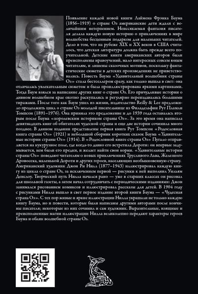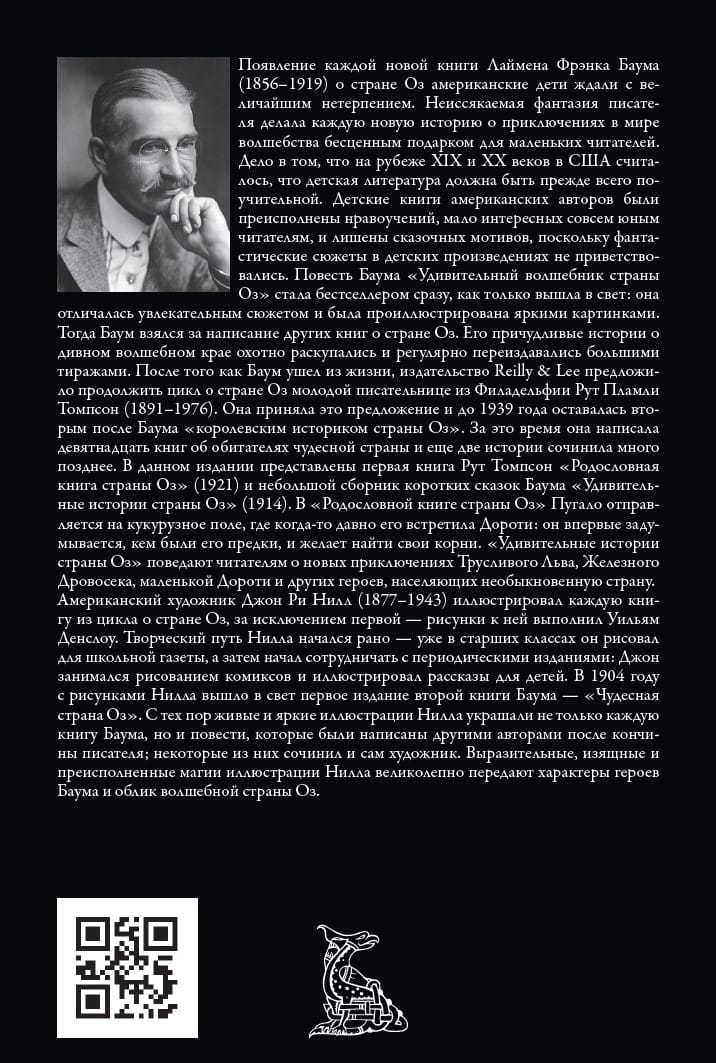 Повесть Баума «Удивительный волшебник страны Оз» стала бестселлером сразу, как только вышла в свет: она отличалась увлекательным сюжетом и была проиллюстрирована яркими картинками. Тогда Баум взялся за написание других книг о стране Оз. Его причудливые истории о дивном волшебном крае охотно раскупались и регулярно переиздавались большими тиражами. После того как Баум ушел из жизни, издательство Reilly & Lee предложило продолжить цикл о стране Оз молодой писательнице из Филадельфии Рут Пламли Томпсон. Она приняла это предложение и до 1939 года оставалась вторым после Баума «королевским историком страны Оз». За это время она написала девятнадцать книг об обитателях чудесной страны и еще две истории сочинила много позднее. В данном издании представлены первая книга Рут Томпсон «Родословная книга страны Оз» и небольшой сборник коротких сказок Баума «Удивительные истории страны Оз».