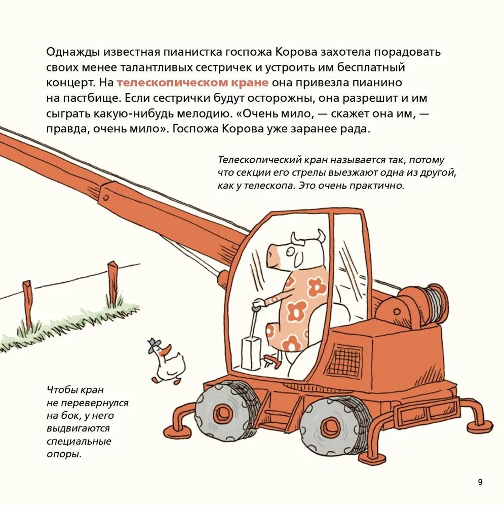 Познакомьтесь с госпожой Овечкой, которая отправляется за покупками на вилочном погрузчике, и с госпожой Коровой, привёзшей пианино на телескопическом кране, чтобы устроить концерт прямо на поле. А как насчёт носорогов, которые замешивают тесто для оладьев исключительно в бетономешалке? Каждая история не только заставит улыбнуться, но и познакомит вашего ребёнка с миром строительных машин!