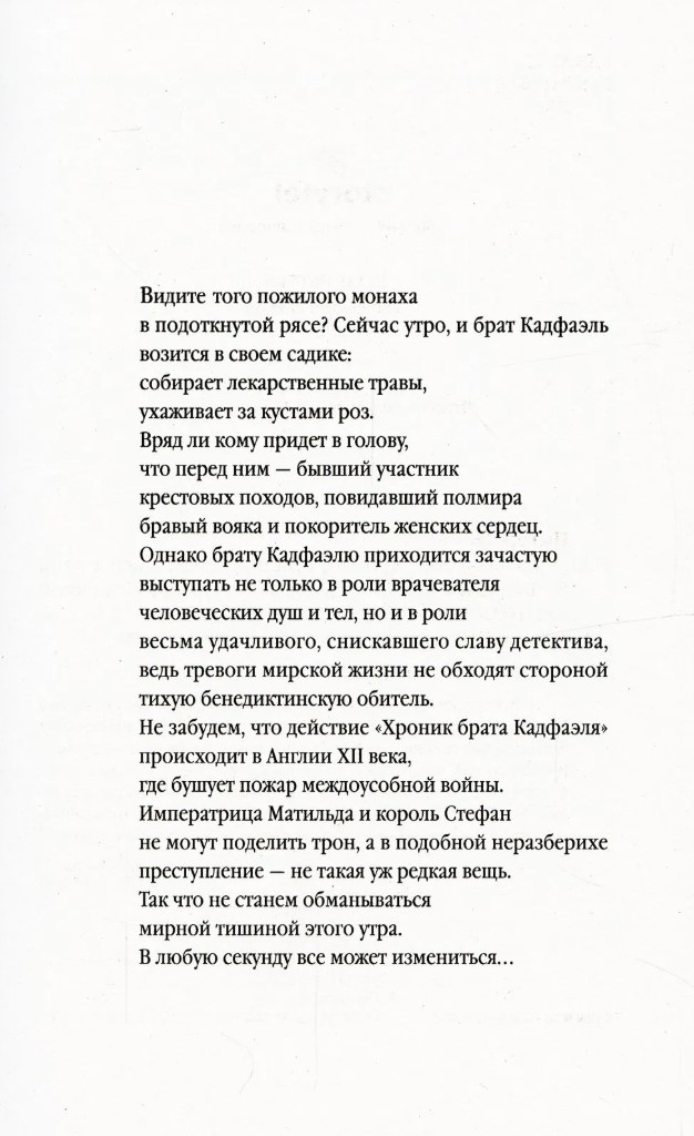 Действие романа «Роковой обет» (1984) происходит в Англии XII века, где бушует пожар гражданской войны. Предательски убит благородный рыцарь, а его наследник исчез, возбудив подозрения. В числе гостей, приехавших в обитель Святых Петра и Павла, находятся неразлучные друзья Мэтью и Сиаран. Однако проницательный глаз брата Кадфаэля замечает в их отношениях что-то необычное. Что же за роковой обет заставил этих двоих пуститься в дорогу?