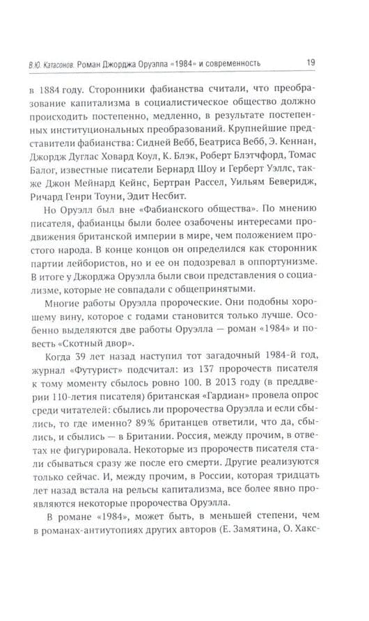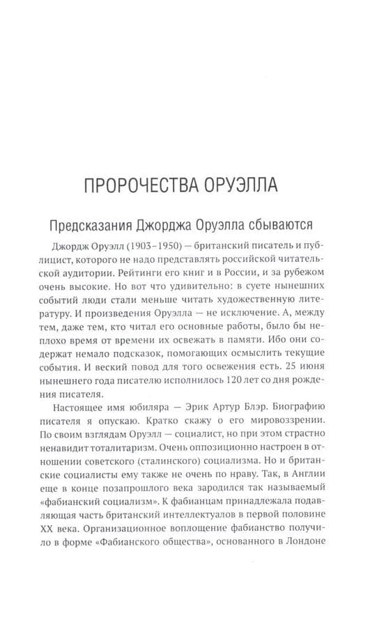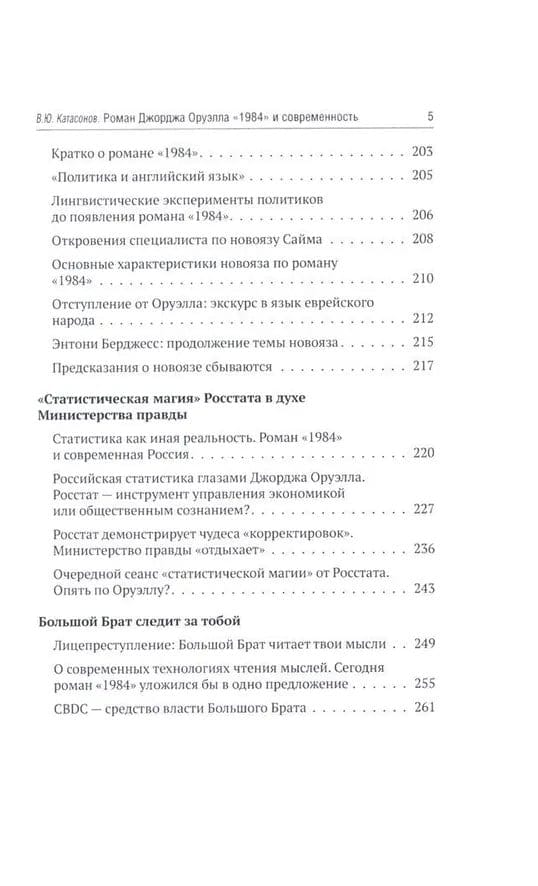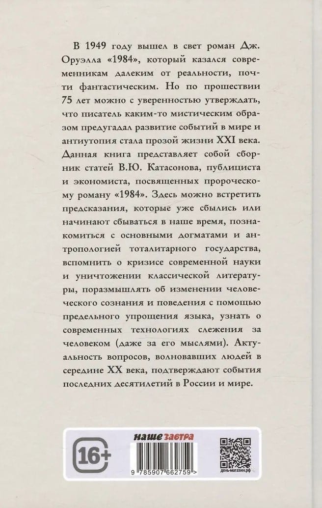 В 1949 году вышел в свет роман Дж. Оруэлла «1984», который казался современникам далеким от реальности, почти фантастическим. Но по прошествии 75-лет можно с уверенностью утверждать, что писатель каким-то мистическим образом предугадал развитие событий в мире и антиутопия стала прозой жизни XXI-века. Данная книга представляет собой сборник статей В. Ю. Катасонова, публициста и экономиста, посвященных пророческому роману «1984». Здесь можно встретить предсказания, которые уже сбылись или начинают сбываться в наше время, познакомиться с основными догматами и антропологией тоталитарного государства, вспомнить о кризисе современной науки и уничтожении классической литературы, поразмышлять об изменении человеческого сознания и поведения с помощью предельного упрощения языка, узнать о современных технологиях слежения за человеком (даже за его мыслями). Актуальность вопросов, волновавших людей в середине XX-века, подтверждают события последних десятилетий в мире.