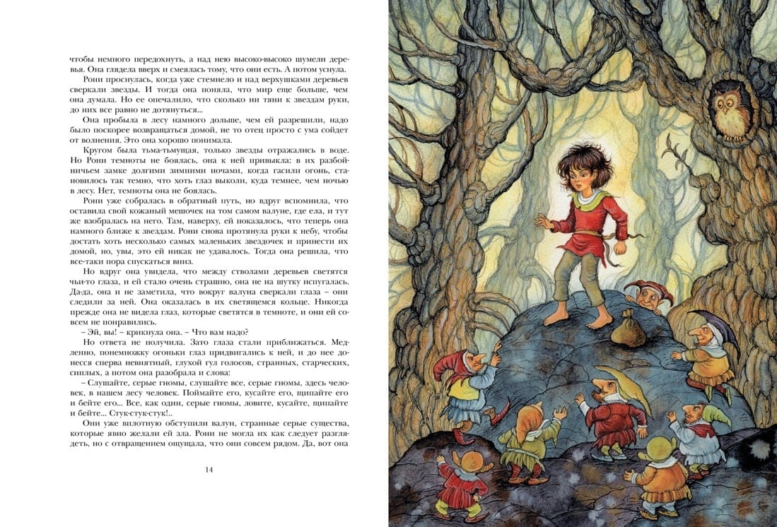 Повесть-сказка Астрид Линдгрен про девочку Рони, дочь самого могучего разбойничьего атамана всех лесов и гор, и про неведомый мир, в котором все необычно, таинственно и странно. А еще она о приключениях, дружбе и любви.