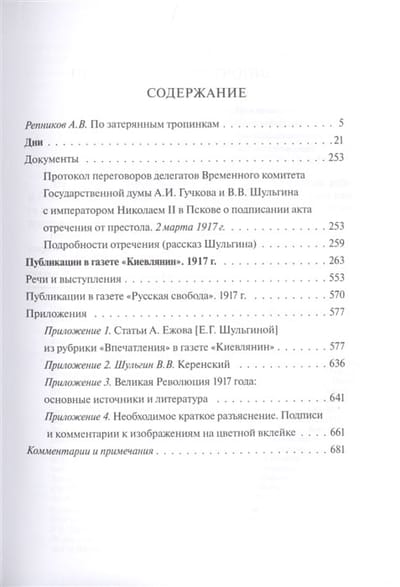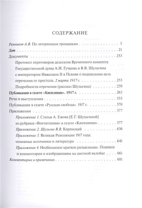 В книгу также вошли воспоминания В. В. Шульгина «Дни», впервые публикующиеся с подробными комментариями. Книга дополнена большим количеством фотографий, изображений открыток и сатирических рисунков революционного года, позволяющих современному читателю в полной мере ощутить это переломное время. Сборник продолжает проект по переизданию публицистического и мемуарного наследия Шульгина, в рамках которого вышли сборники «Россия, Украина, Европа» (Посев, 2015) и «1920 год. Очерки. Три столицы (первое полное издание в России)» (Посев, 2016). Издание предназначено для широкого круга читателей.