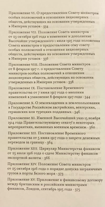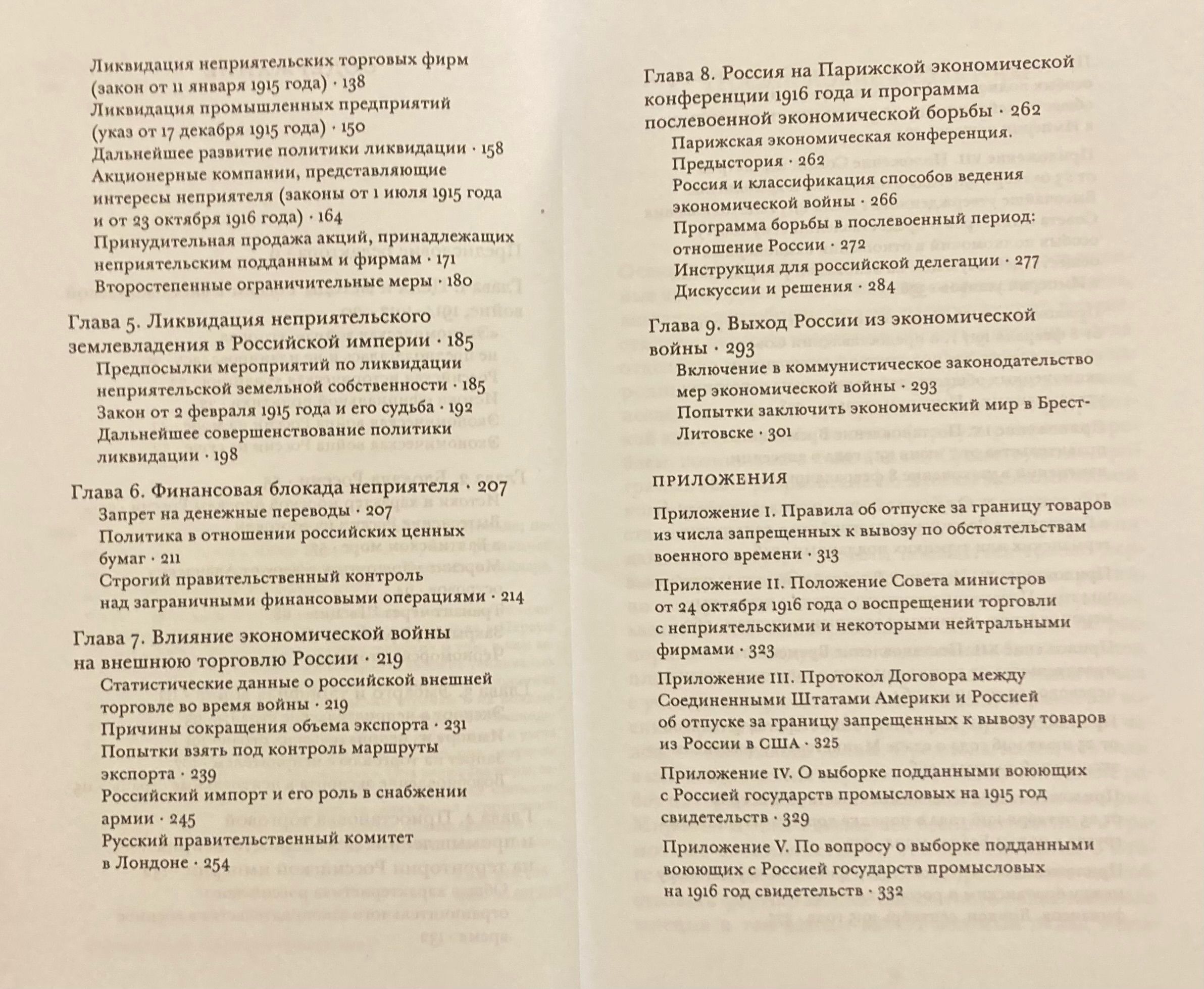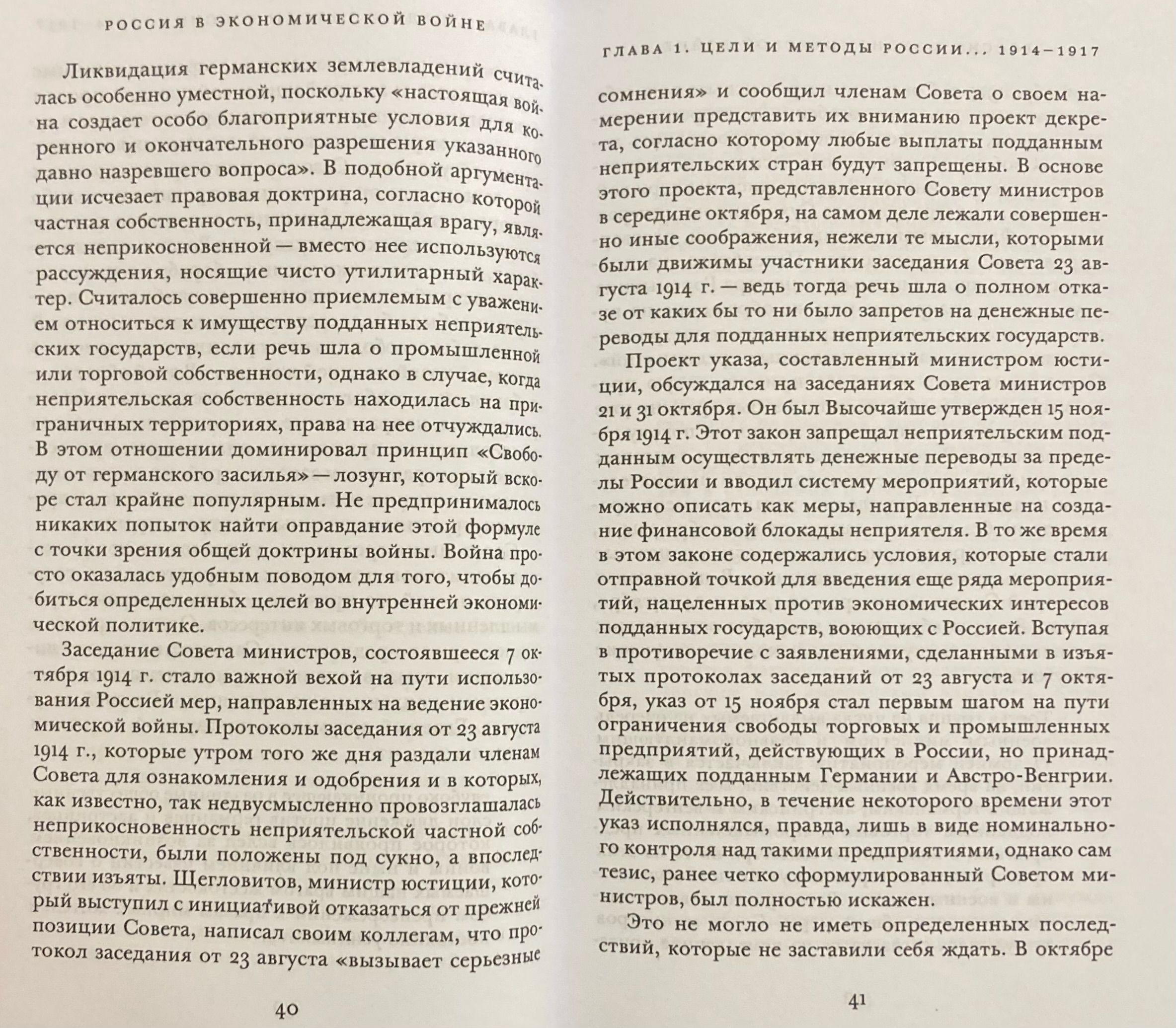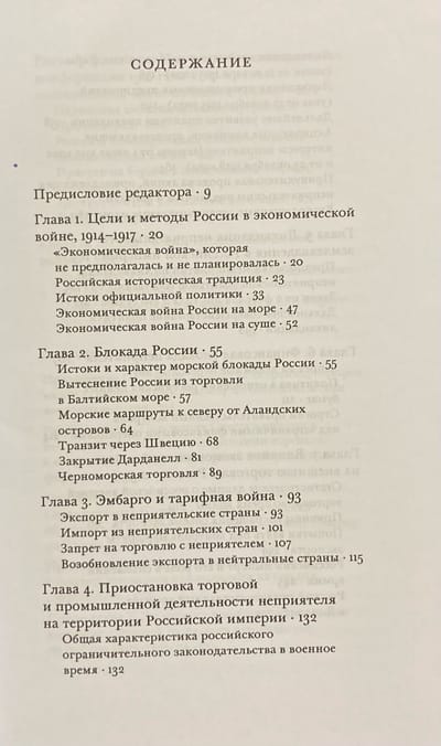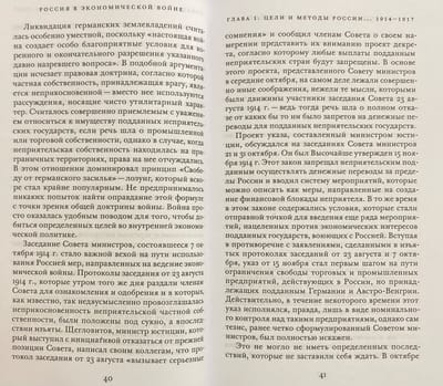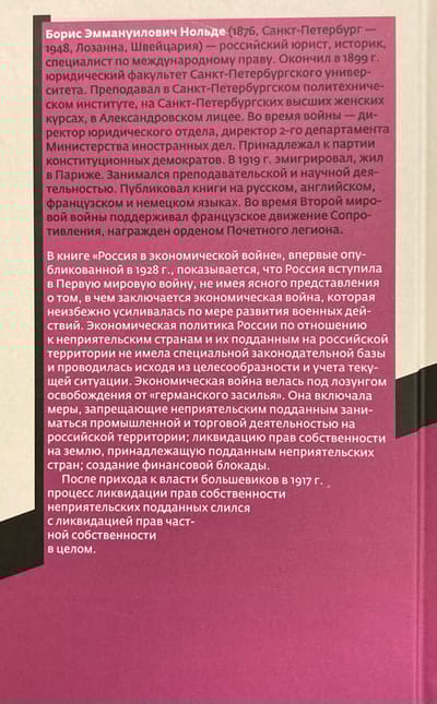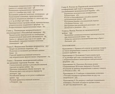 В книге «Россия в экономической войне», впервые опубликованной в 1928 г., показывается, что Россия вступила в Первую мировую войну, не имея ясного представления о том, в чем заключается экономическая война, которая неизбежно усиливалась по мере развития военных действий. Экономическая политика России по отношению к неприятельским странам и их подданным на российской территории не имела специальной законодательной базы и проводилась исходя из целесообразности и учета текущей ситуации. Экономическая война велась под лозунгом освобождения от «германского засилья». Она включала меры, запрещающие неприятельским подданным заниматься промышленной и торговой деятельностью на российской территории; ликвидацию прав собственности на землю, принадлежащую подданным неприятельских стран; создание финансовой блокады.