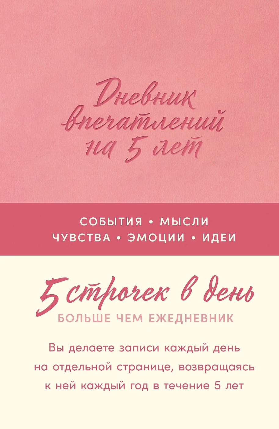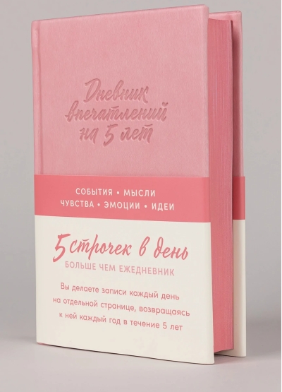 «Дневник впечатлений на 5 лет» создан для того, чтобы вы могли записывать что-то особенное о каждом дне. Хотите ли вы зафиксировать свои достижения, мысли, идеи или красоту момента, оставить на будущее важные размышления, заметить перемены и задуматься о главном — дневник идеально для этого подойдет.