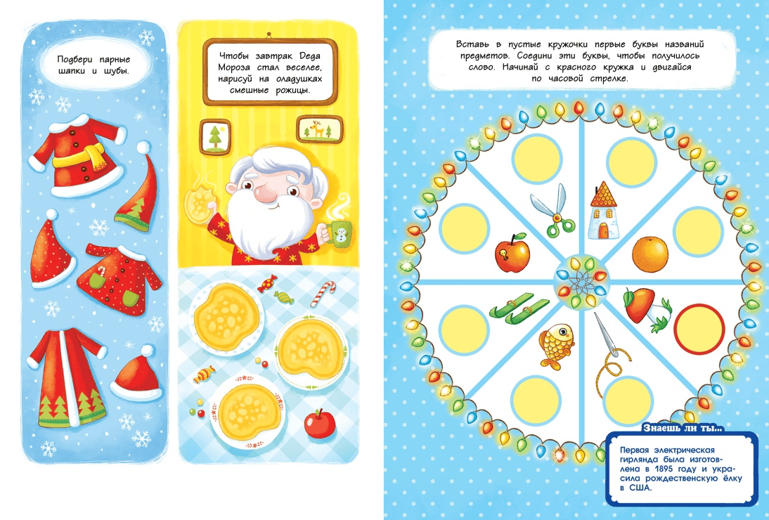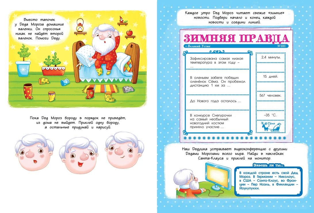 Новый год – время волшебства и сюрпризов! А кто может создать отличное настроение лучше, чем Дед Мороз? Однако у Деда Мороза зимой так много дел: прочитать письма, упаковать подарки и развезти их, смастерить игрушки для ёлки, устроить видеоконференцию с Санта-Клаусом… и много-много чего ещё. Но ты можешь помочь ему прямо сейчас! Достаточно взять цветные карандаши и открыть эту книжку. Тебя ждут игры с яркими наклейками, раскраски и рисовалки, путаницы, задания-считалки и поделка, а также красочные маски для весёлого праздника!