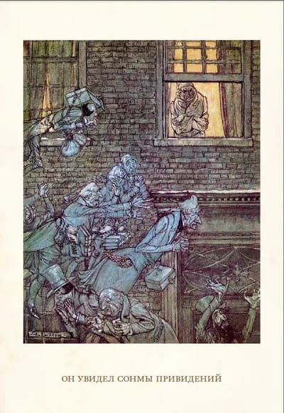 Звон монет — самый сладкий звук для мистера Скруджа. Звон счастливых голосов ему ненавистен. «Никакое тепло не могло его обогреть», и никакой мороз не пробирал этого мрачного скрягу. Но однажды, в канун Рождества, сердце Скруджа забилось с невиданной для него силой: к нему в гости зашёл его старый компаньон. Компаньон, который давно умер…Дух этой мистической истории передают волшебные рисунки Артура Рэкхема.