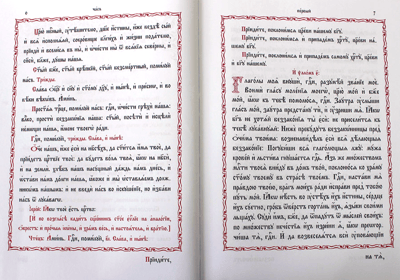 Первая часть книги содержит Последование часов, «певаемых в навечерие Рождества Христова», и Службу на Рождество Господа Бога и Спаса нашего Иисуса Христа, которые изложены по возможности полно, так чтобы можно было служить, почти не обращаясь к другим книгам. Текст напечатан крупным церковнославянским шрифтом в две краски. Стихиры, ирмосы и другие поемые части службы размечены для пения. Нарядные заставки, концовки и буквицы не только радуют глаз, но и помогают легче отыскать нужное место в службе.