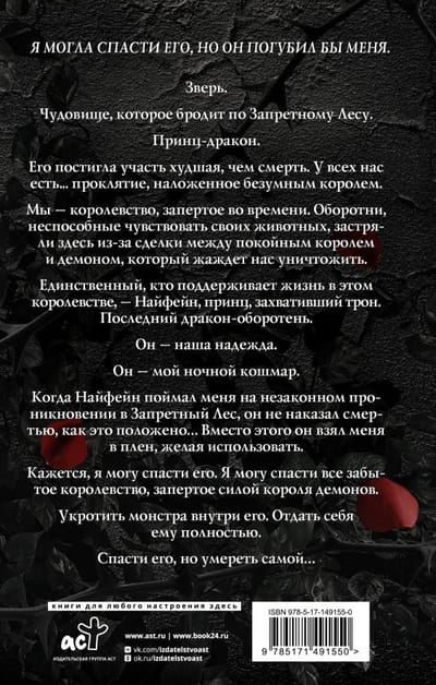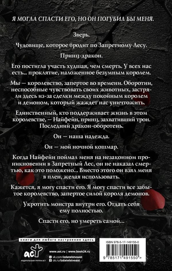 Зверь. Чудовище, которое бродит по Запретному Лесу. Принц дракон. Его постигла участь худшая, чем смерть. У всех нас есть... проклятие, наложенное безумным королем. Мы — королевство, запертое во времени. Оборотни, неспособные чувствовать своих животных, застряли здесь из за сделки между покойным королем и демоном, который жаждет нас уничтожить. Единственный, кто поддерживает жизнь в этом королевстве, — Нифейн, принц, захвативший трон. Последний дракон оборотень. Он — наша надежда. Он — мой ночной кошмар. Когда Нифейн поймал меня на незаконном проникновении в Запретный Лес, он не наказал смертью, как это положено... Вместо этого он взял меня в плен, желая использовать. Кажется, я могу спасти его. Я могу спасти все забытое королевство, запертое силой короля демонов. Укротить монстра внутри его. Отдать себя ему полностью. Спасти его, но умереть самой...