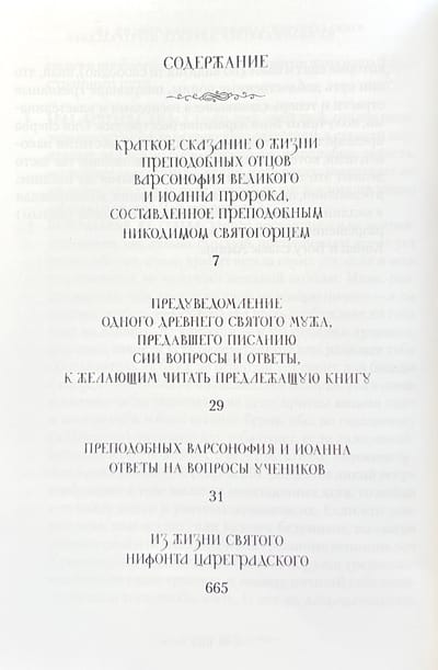 «Примите, возлюбленные братия, душеполезнейшую книгу сию с радостью и усердием и читайте ее прилежно, ибо она весьма полезна архиереям и иереям, начальствующим и судиям, а особенно монахам: безмолвствующим и общежительным, новоначальным, средним и совершенным, преимущественно же немощным, находящимся в различных искушениях и страданиях и имеющим посему нужду в духовном утешении», — с такими словами вкладывает эту книгу в руки читателя ее первый публикатор — преподобный Никодим Святогорец. И поистине всякий прислушавшийся к его советам обретает себе в собеседники великих богоносных мужей. Святой Варсонофий жил в VI веке, и в течение пятидесяти лет и более ни один человек, кроме игумена, не видел этого подвижника, ибо он заключил себя в малой келлии, как в гробе, не вкушая иной пищи, кроме хлеба и воды. Другой старец, преподобный Иоанн, проходил такое же безмолвное житие и сподобился таких же дарований Духа, в особенности же дарования прозорливости, почему и именовался Пророком. Издание подготовлено по: Преподобных отцев Варсануфия Великаго и Иоанна руководство к духовной жизни, в ответах на вопрошения учеников.