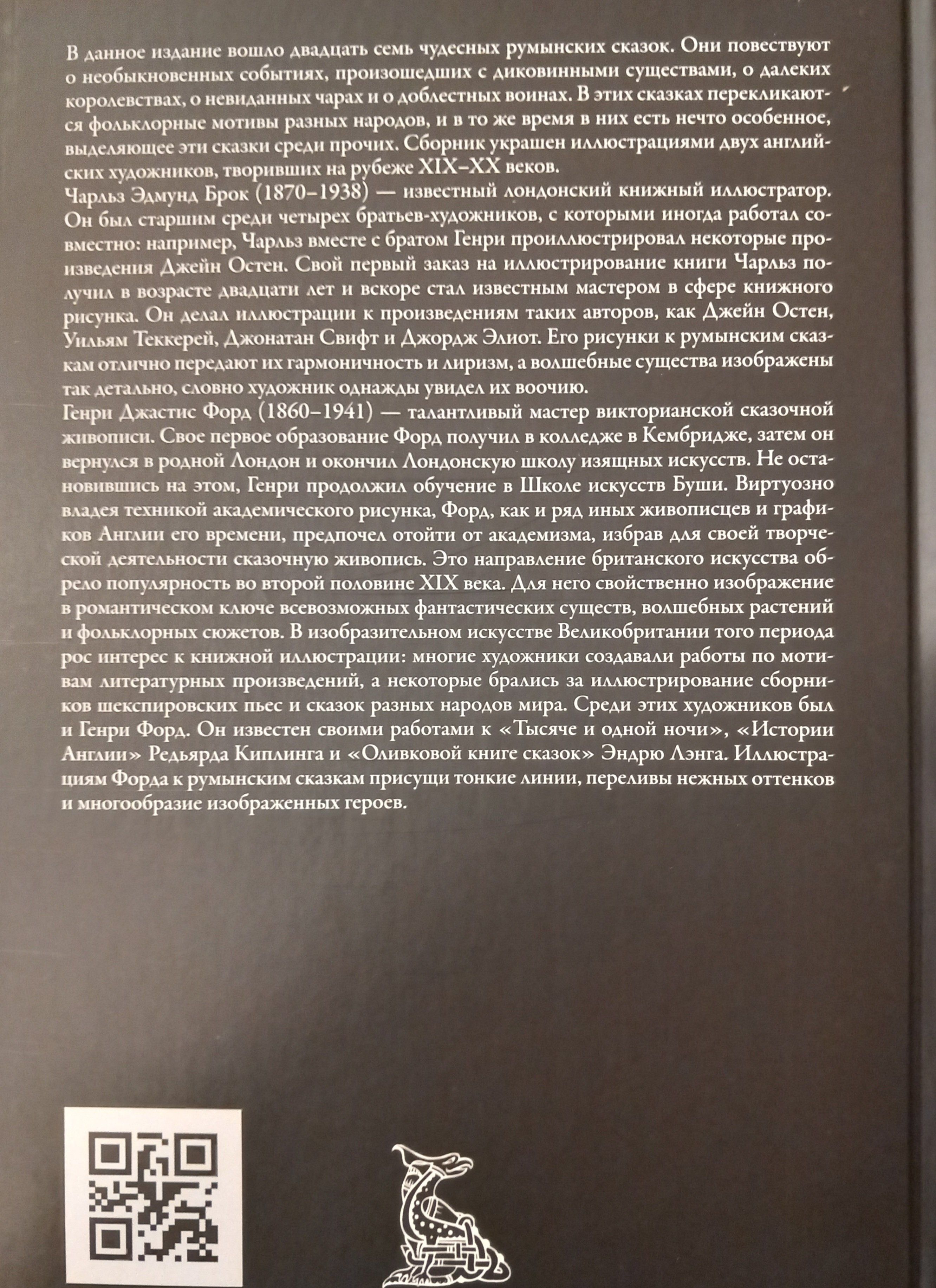 В данное издание вошло двадцать семь чудесных румынских сказок. Они повествуют о необыкновенных событиях, произошедших с диковинными существами, о далеких королевствах, о невиданных чарах и о доблестных воинах. Перевод сказок на русский язык выполнил Сергей Юрьевич Афонькин. Сборник украшен иллюстрациями двух английских художников, выдающихся книжных иллюстраторов, творивших на рубеже XIX–XX веков, — Чарльза Брока (1870–1938) и Генри Джастиса Форда (1860–1941).