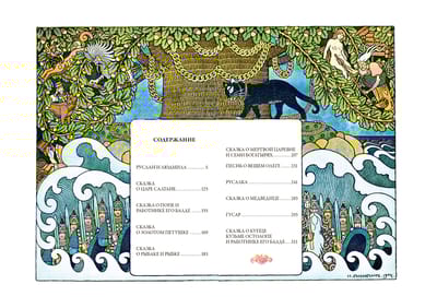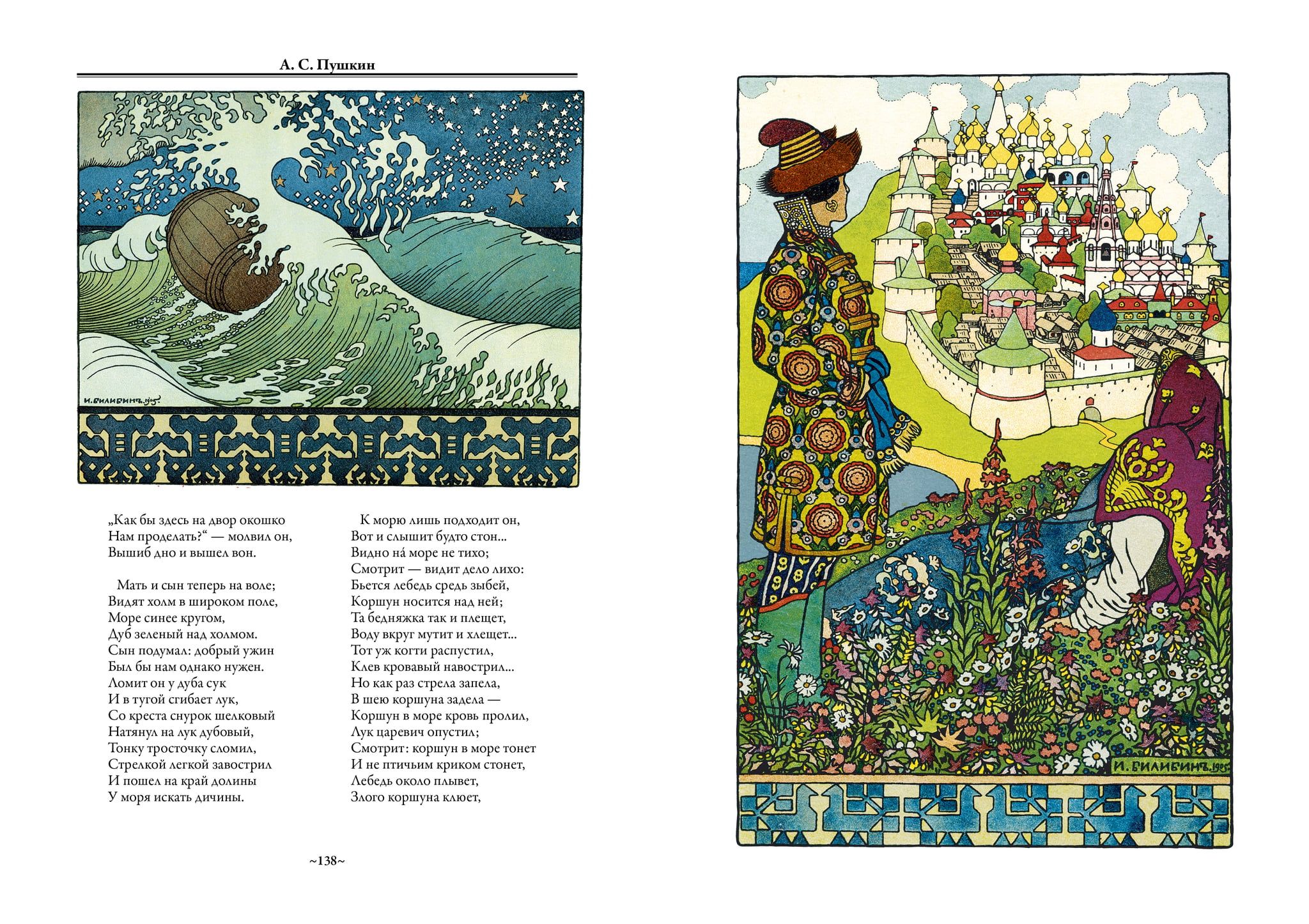 Сборник включает десять произведений А. С. Пушкина — поэму «Руслан и Людмила» с предисловием историка литературы М. Г. Халанского, стихотворение «Песнь о вещем Олеге» и восемь стихотворных сказок, включая «Сказка о попе и работнике его Балде». В конце сборника приводится также эта сказка, переработанная в 1840 году по цензурным соображениям Жуковским, с иллюстрациями из журнала «Шут». Тексты всех сказок украшены великолепными рисунками восьми художников, среди которых такие мастера книжной иллюстрации как И. Я. Билибин,Б. В. Зворыкин и В. М. Васнецов.