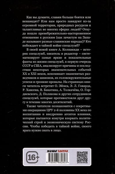 В своей новой книге А. Колпакиди — историк спецслужб, писатель и редактор — систематизирует самые яркие и показательные факты из жизни спецслужб, в первую очередь СССР и США, анализирует причины и последствия некоторых знаменательных событий XX и XXI веков, вспоминает знаменитых разведчиков и шпионов, их головокружительные успехи и громкие провалы. На страницах книги читатель встретит О. Эймса, Э. Л. Говарда, Р. Хансена, В. Бакатина, А. Толкачёва, О. Гордиевского, Д. Полякова и других сотрудников спецслужб, которые противостояли друг другу в течение многих десятилетий.