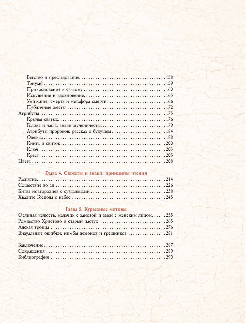 В первой главе описаны геометрические принципы, которые позволяют иконописцам рассказывать о пространстве и об изображаемых предметах. В следующих главах речь идет о знаках — малозаметных элементах, из которых строится любой визуальный рассказ, и о мотивах, повторяющихся в разных композициях. Наконец, в последней главе автор рассматривает необычные вариации некоторых сюжетов.
