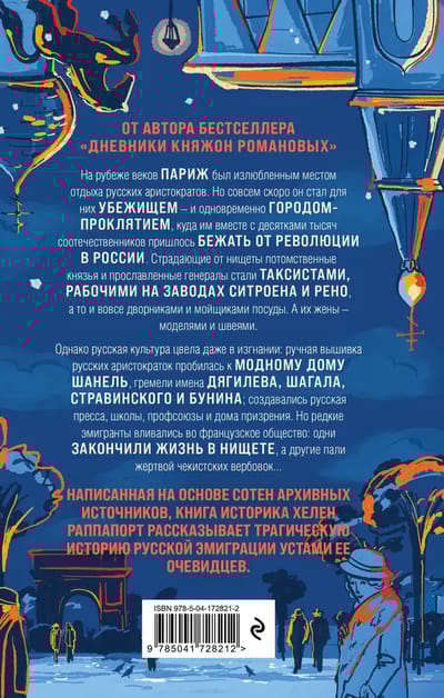 На рубеже веков Париж был излюбленным местом отдыха русских аристократов, тративших в местных ресторанах и кабаре баснословные суммы. Но всего через пару десятилетий он стал убежищем для десятков тысяч русских, — и одновременно городом-проклятием, где они страдали от нищеты и тоски по России. Потомственные князья и прославленные генералы становились таксистами, рабочими на заводах Ситроена и Рено, а то и вовсе дворниками и мойщиками посуды. А их жены — моделями и швеями. Несмотря на все тяготы, русская культура цвела даже в Париже — ручная вышивка талантливых аристократок нашла свою дорогу к модному дому Шанель. Гремели имена Дягилева, Шагала, Стравинского и Бунина; создавалась русская пресса, школы, профсоюзы и дома призрения. Но далеко не всем эмигрантам удавалось влиться во французское общество: одни закончили жизнь в нищете, а некоторые пали жертвой чекистских вербовок... Написанная на основе сотен архивных источников, книга историка Хелен Раппапорт — это красочный репортаж из прошлого, рассказывающий трагическую историю русской эмиграции устами ее очевидцев.