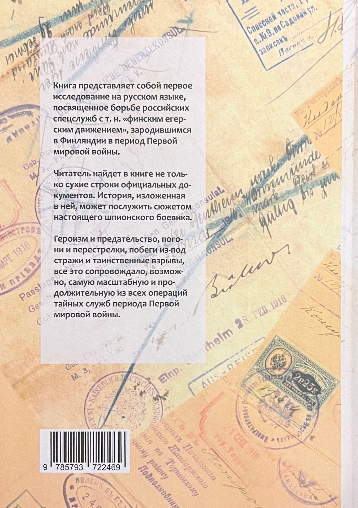 Книга представляет собой первое исследование на русском языке, посвященное борьбе российских спецслужб с т.н. «финским егерским движением», зародившимся в Финляндии в период Первой мировой войны. Автор, используя в работе ранее неизвестные архивные материалы, описывает, возможно, самую масштабную и продолжительную из всех операций тайных служб периода Первой мировой войны. Географически она захватывала не только территорию Финляндии, но и разворачивалась на огромных пространствах как Северной Европы (включая Германию и Скандинавские страны), так и значительной части Российской Империи, вплоть до Дальнего Востока.   Книга предназначена для всех, кто интересуется историей отечественной контрразведки, историей Первой Мировой войны, военной историей России и Финляндии и историей российско-финляндских отношений.