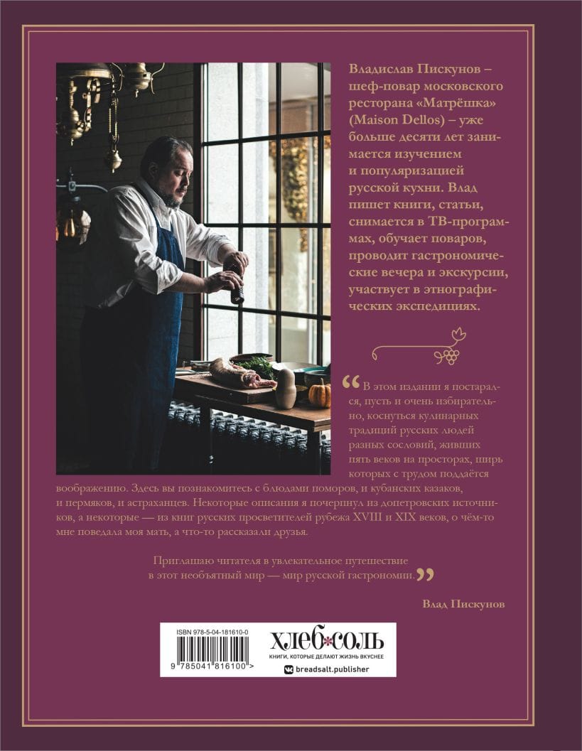 «Русская кухня. Главное за 500 лет» — переработанный вариант трехтомника шеф-повара ресторана «Матрешка», популяризатора русской кухни и автора множества кулинарных книг и статей — Владислава Пискунова. Автор выбрал для вас лучшее и оставил главное. Влад уже более 10 лет изучает русскую кухню: собирает рецепты из книг отечественных авторов, путешествует по России, общается с хранителями кулинарных традиций и ищет названия незнакомых русских блюд в «Толковом словаре живого великорусского языка» В. Даля. Автор «Русской кухни» сам приготовил, сфотографировал и съел блюда, которые вы теперь можете повторить самостоятельно!