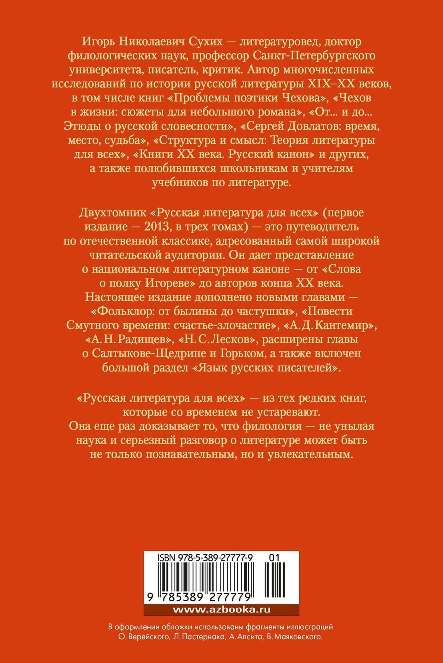 Двухтомник «Русская литература для всех» (первое издание — 2013, в трех томах) — это путеводитель по отечественной классике, адресованный самой широкой читательской аудитории. Он дает представление о национальном литературном каноне — от «Слова о полку Игореве» до авторов конца ХХ века. Настоящее издание дополнено новыми главами — «Фольклор: от былины до частушки», «Повести Смутного времени: счастье-злочастие», «А. Д. Кантемир», «А. Н. Радищев», «Н. С. Лесков», расширены главы о Салтыкове-Щедрине и Горьком, а также включен большой раздел «Язык русских писателей».