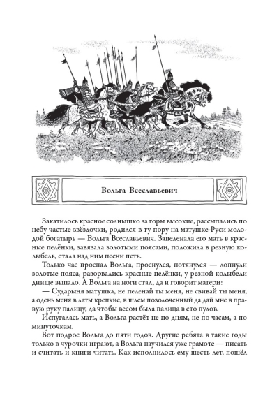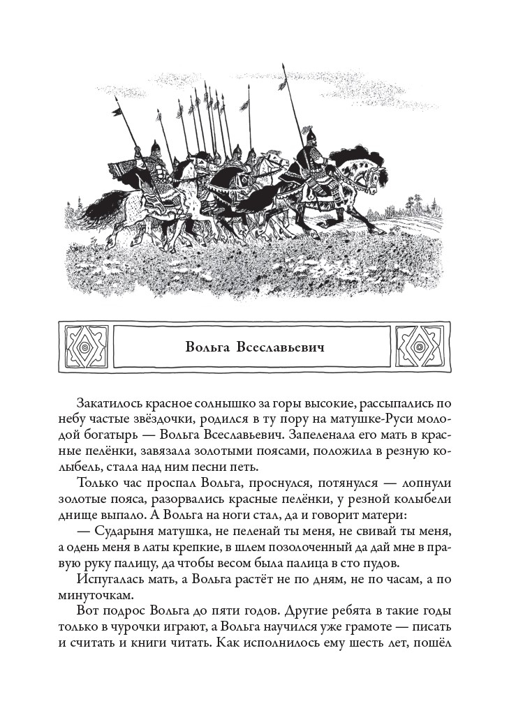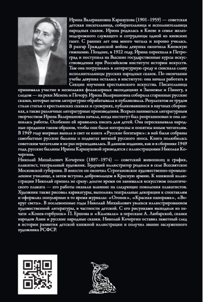 Издание включает девятнадцать русских былин. Они рассказывают читателям о славных подвигах могучих витязей, об их победах над злыми недругами и верной службе родной земле. Сказания о любимых в народе Алеше Поповиче, Добрыне Никитиче, Илье Муромце и других богатырях приводятся в литературной обработке советской писательницы и фольклориста Ирины Валериановны Карнауховой. Чудесные самобытные иллюстрации к ним выполнил талантливый советский художник Николай Михайлович Кочергин.