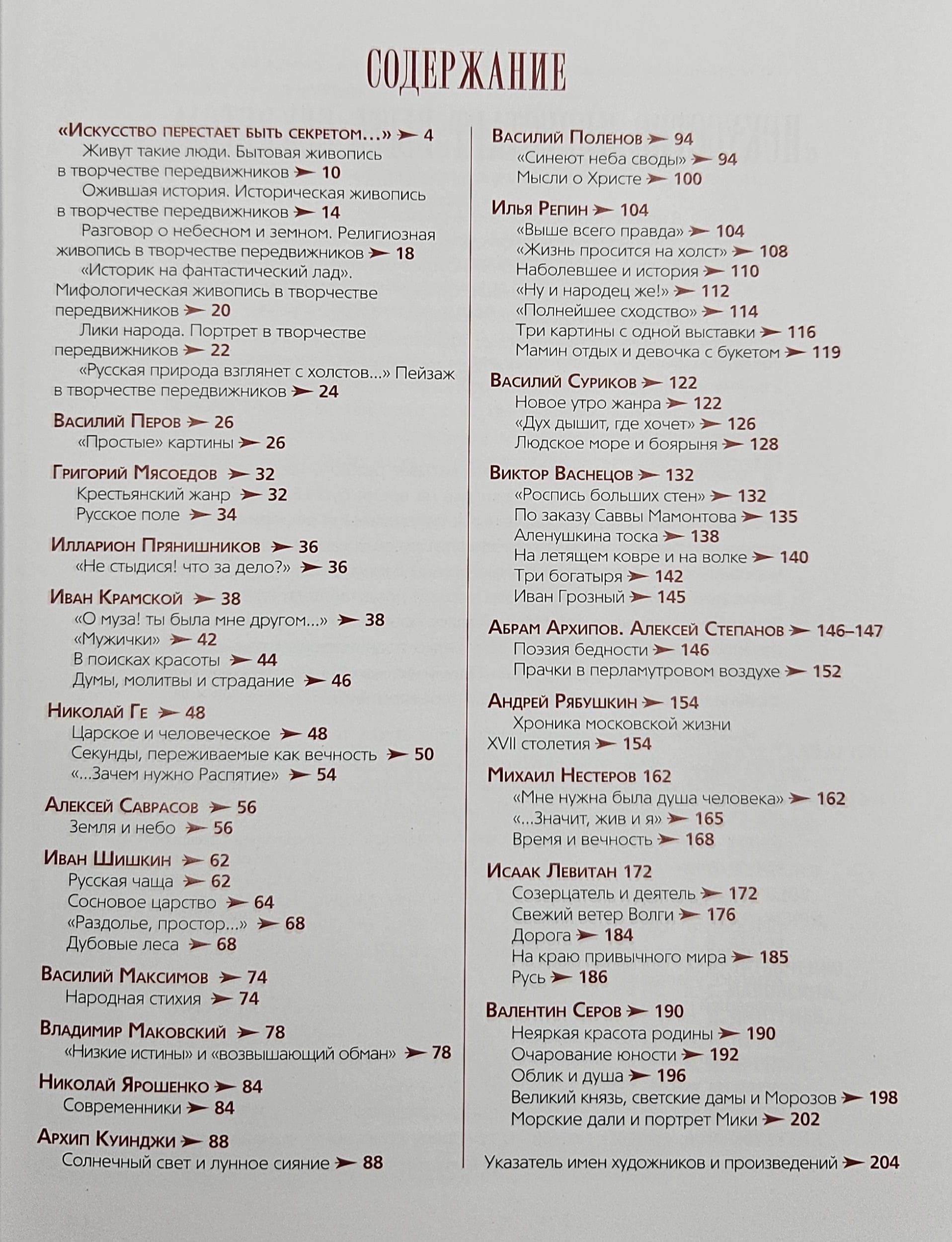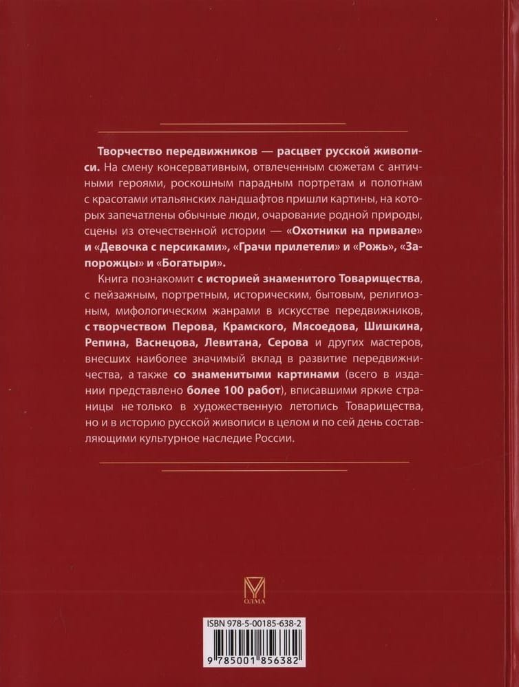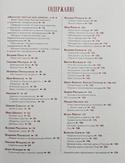 Книга познакомит с историей знаменитого Товарищества, с пейзажным, портретным, историческим, бытовым, религиозным, мифологическим жанрами в искусстве передвижников, с творчеством Перова, Крамского, Мясоедова, Шишкина, Репина, Васнецова, Левитана, Серова и других мастеров, внесших наиболее значимый вклад в развитие передвижничества, а также со знаменитыми картинами (всего в издании представлено более 100 работ), вписавшими яркие страницы не только в художественную летопись Товарищества, но и в историю русской живописи в целом и по сей день составляющими культурное наследие России.