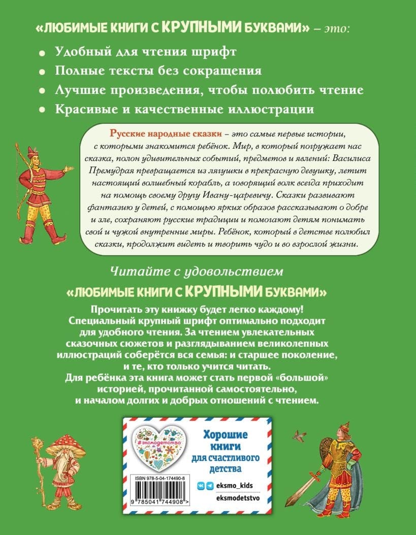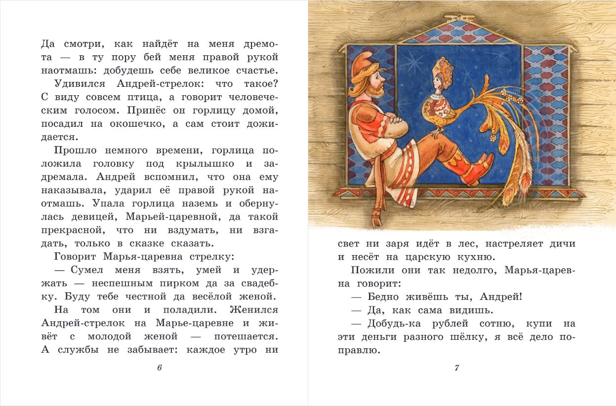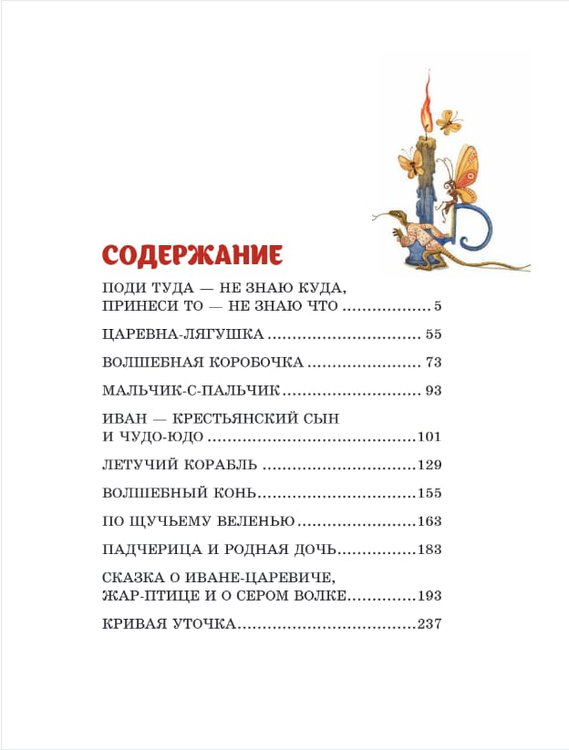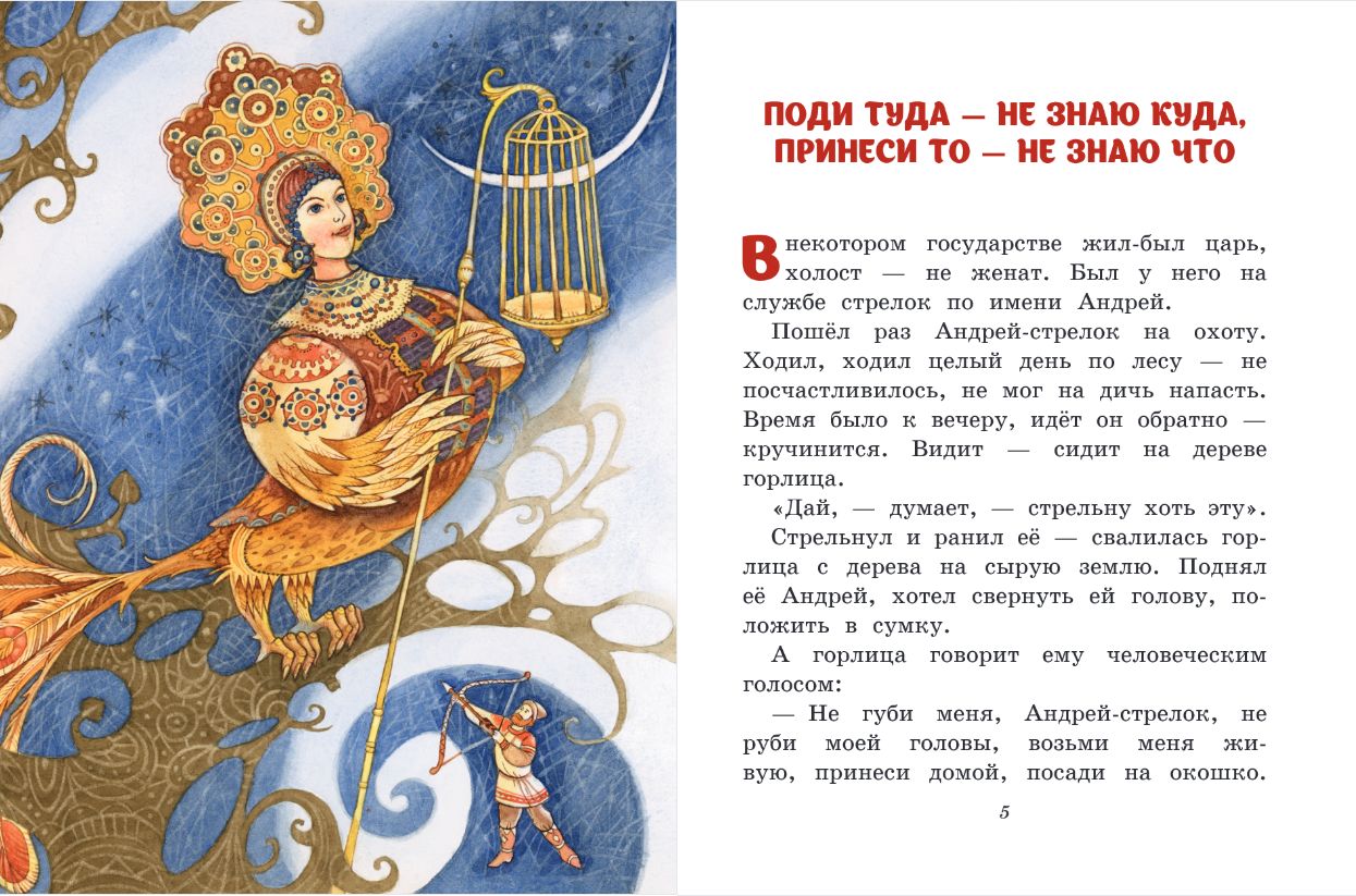 В книгу вошло 11 русских народных сказок: «Поди туда — не знаю куда, принеси то — не знаю что», «Царевна-лягушка», «Летучий корабль», «По щучьему велению» и другие. С помощью простых историй, которые создал русский народ, дети начинают своё знакомство с миром: на ярких образах учатся различать добро и зло, развивают фантазию, узнают много нового о русском фольклоре, традициях и языке. Сказки проверены многими поколениями читателей, которые на них выросли и сохранили добрую память о них и во взрослой жизни.