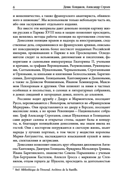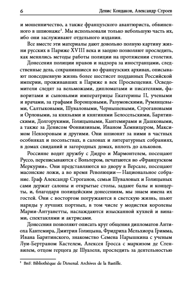 В книге, составленной Д. Кондаковым и А. Строевым, собраны полицейские донесения, которые рисуют психологический портрет русского дворянства эпохи Просвещения и заодно позволяют проследить эволюцию французского сыска на протяжении XVIII века.