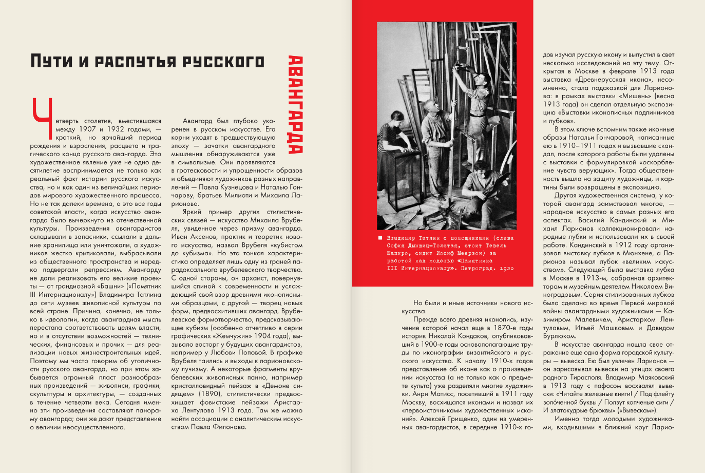 Русский авангард — уникальное, невероятно мощное и яркое явление в истории мировой культуры. Участниками этого процесса было небольшое сообщество художников, создававших в своих работах новую эстетическую реальность. Новаторы, искатели и экспериментаторы, они стали мировыми звездами, ставившими неоспоримый след в истории искусства. Среди них Казимир Малевич, Михаил Ларионов, Наталья Гончарова, Василий Кандинский, Владимир Татлин, Эль Лисицкий.